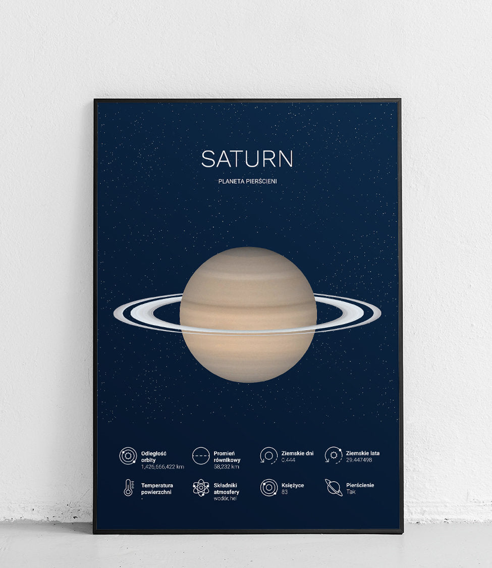 Ten plakat przedstawia Saturn. To szósta planeta od Słońca i druga zaraz po Jowiszu pod względem wielkości planeta Układu Słonecznego. Jest to gazowy olbrzym, charakteryzujący się dziewięcioma najbardziej rozległymi i dostrzegalnymi pierścieniami, które tworzy przede wszystkim lód i odłamki skalne.