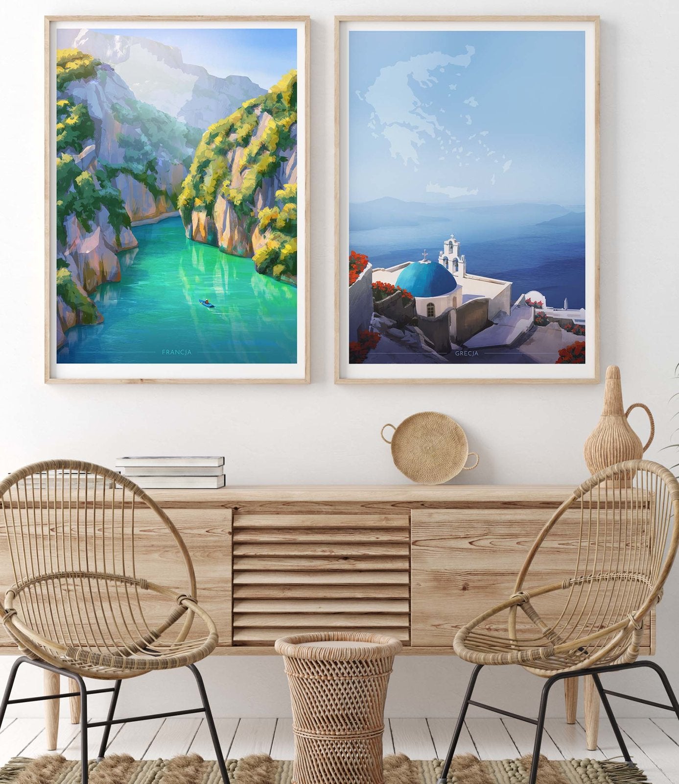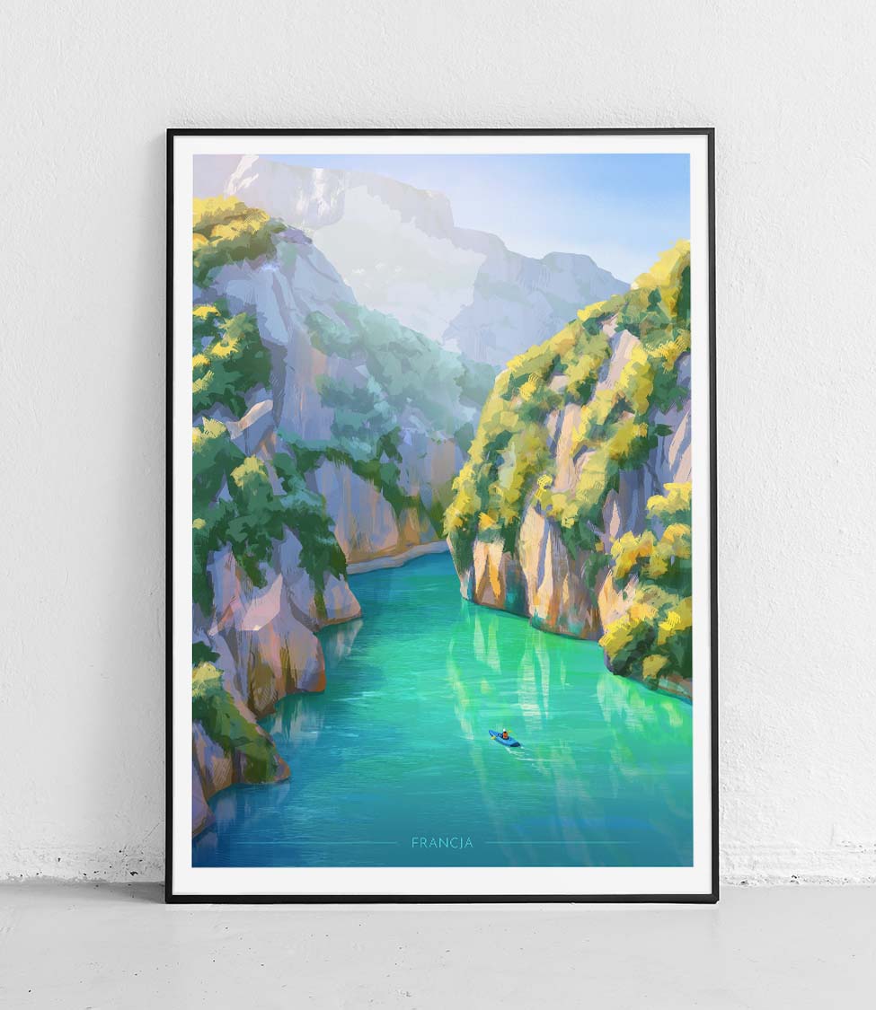 Ten plakat przedstawia region szczególny, Francję. Plakat Francja ukazuje przepiękny widok na malowniczo położoną przełom rzeki Verdon przez wapienne skały jurajskie w południowej Francji, w Prowansji. Rzeka wyrzeźbiła w nich na długości 21 km kilkusetmetrowej głębokości kanion, jeden z najgłębszych w Europie. W najgłębszym miejscu mierzy on 700 m głębokości, przy dnie kanionu ma szerokość od 6 do 100 m, górne krawędzie odległe są od siebie od 200 do 1500 m. Popularny rejon do uprawiania wspinaczki skałkowej.