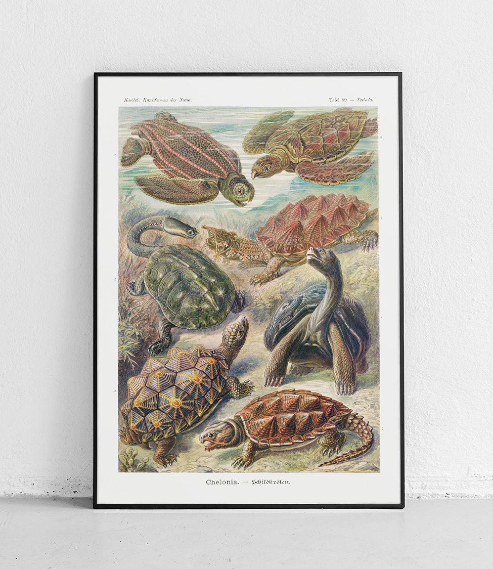 Ta oryginalna ilustracja "Żółwie" (Chelonia–Schildkröten) z serii "Rośliny" została wykonana przez Ernst'a Haeckel (1834- 1919), niemiecki biolog, filozof i podróżnik.