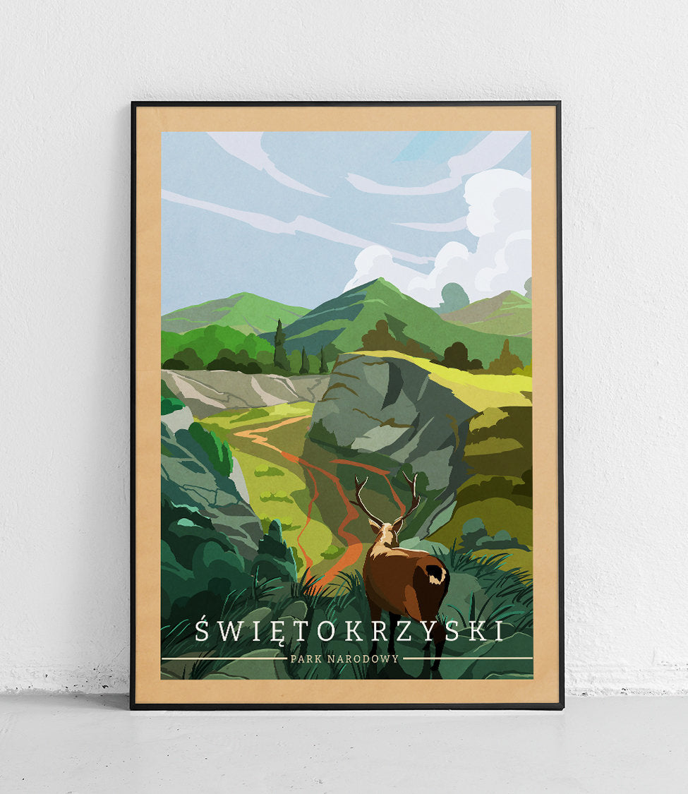 to jeden z 23 parków narodowych, położony w centralnej części Gór Świętokrzyskich. W parku żyje 45 gatunków ssaków, głównie sarny europejskie, jelenie oraz dziki. Symbolem Parku jest jeleń, tym samym musiał się on pojawić na plakacie.Świętokrzyski Park Narodowy plakat to dzieło Macieja Ptasińskiego. Jedyny w swoim rodzaju plakat polskiej turystyki, wykonany specjalnie na nasze zamówienie.