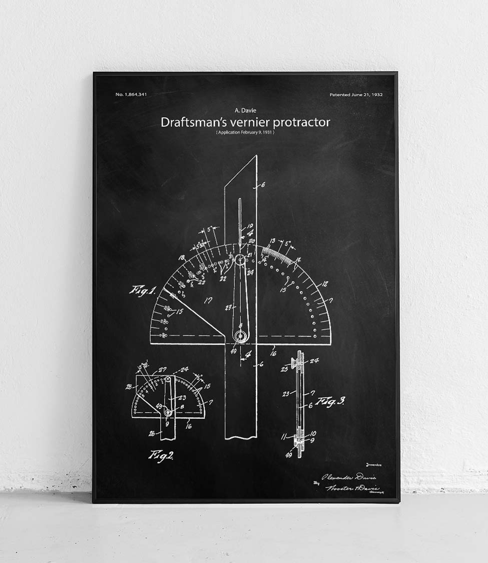 Plakat z reprodukcją patentu przedstawiającego kątomierz nastawny autorstwa Alexandra Davie.