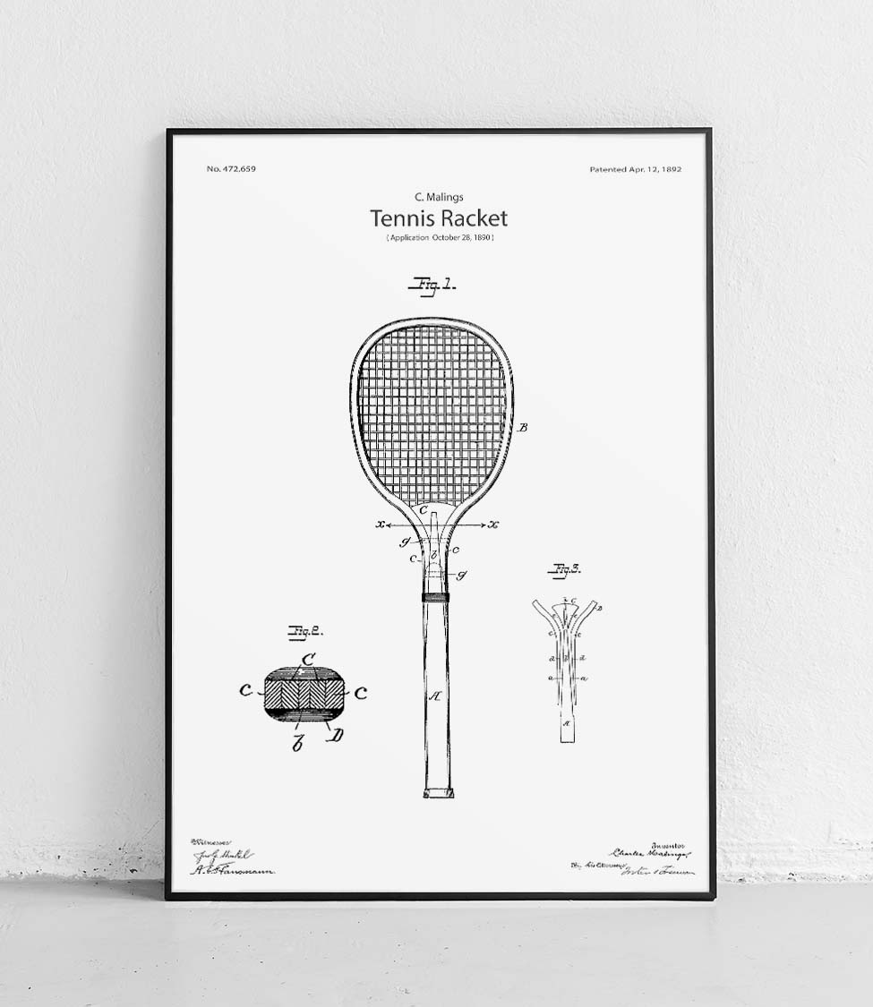 Plakat z reprodukcją patentu rakiety do tenisa autorstwa Charles'a Malings.