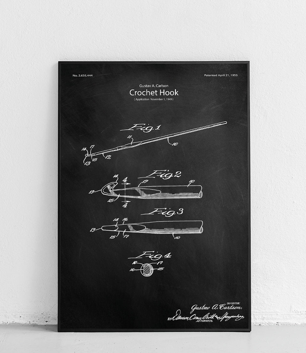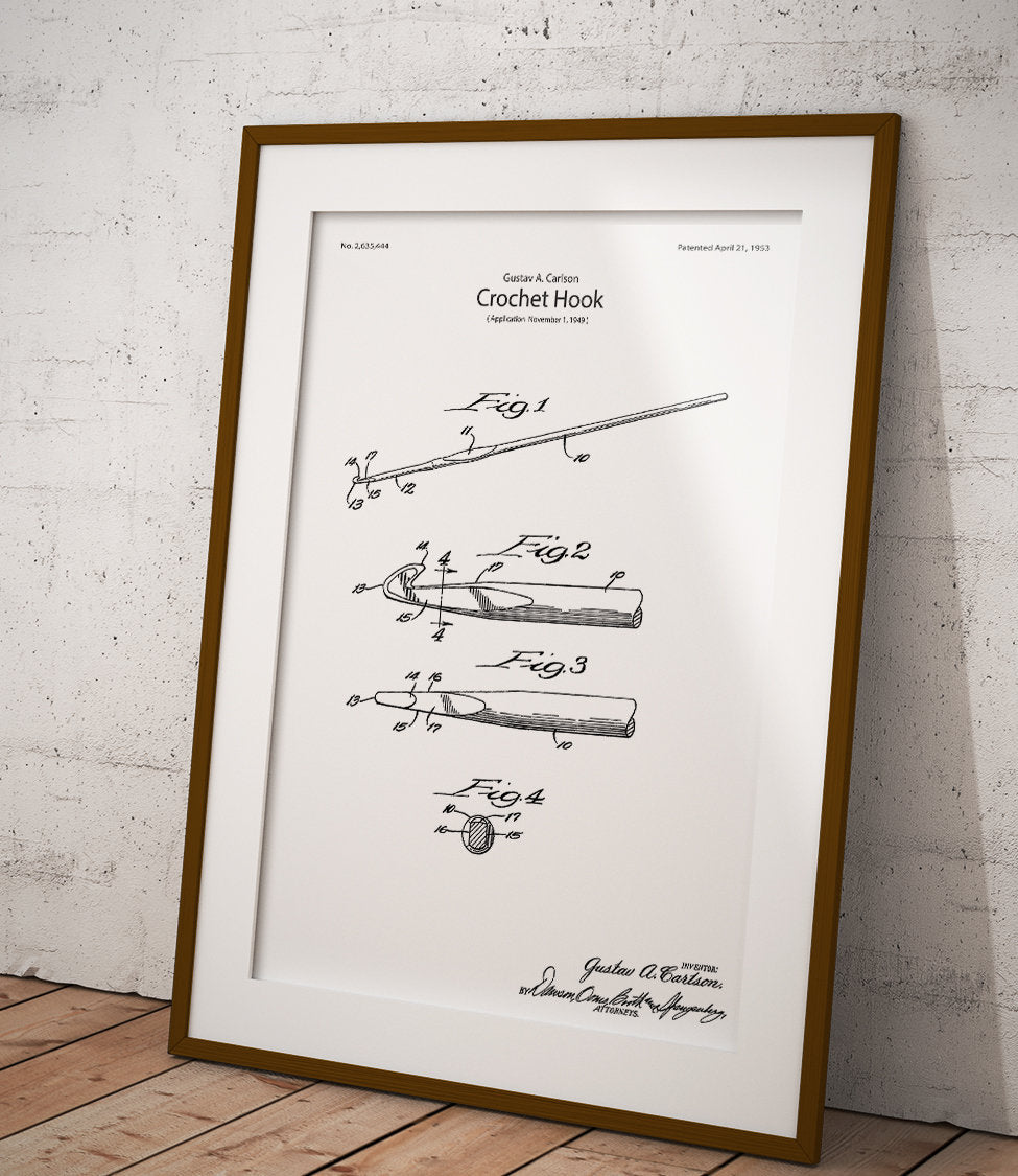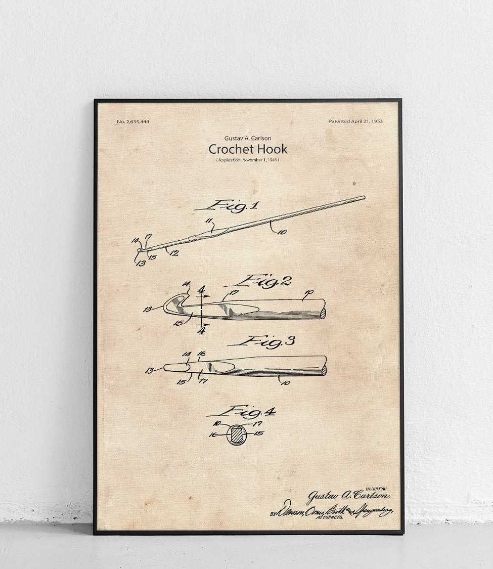 Plakat z reprodukcją patentu przedstawiającego szydełko, autorstwa Gustav'a A. Carlson.