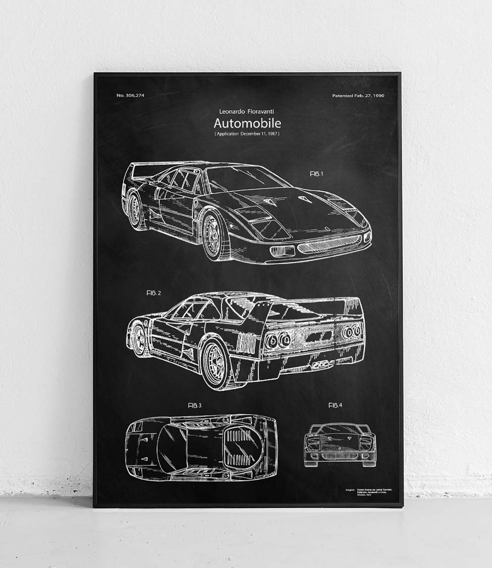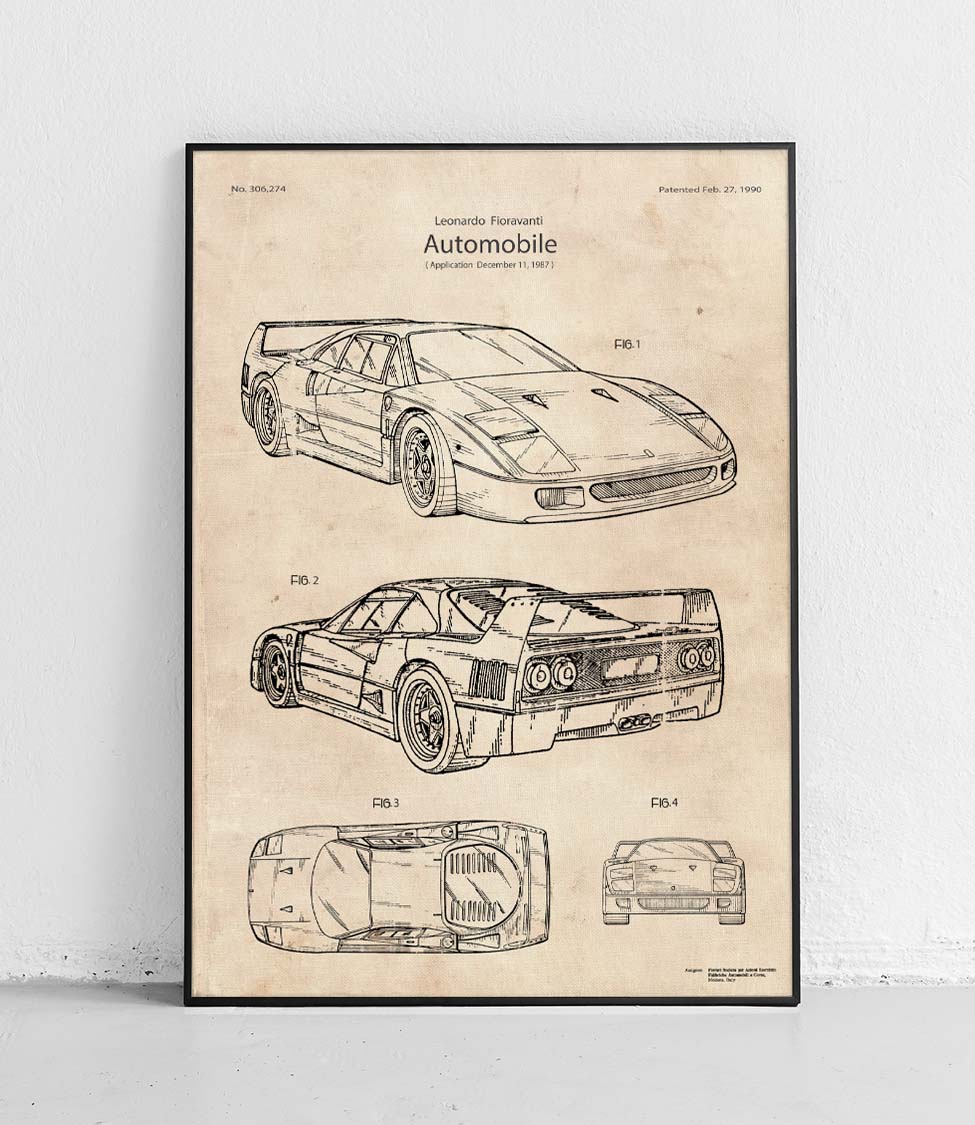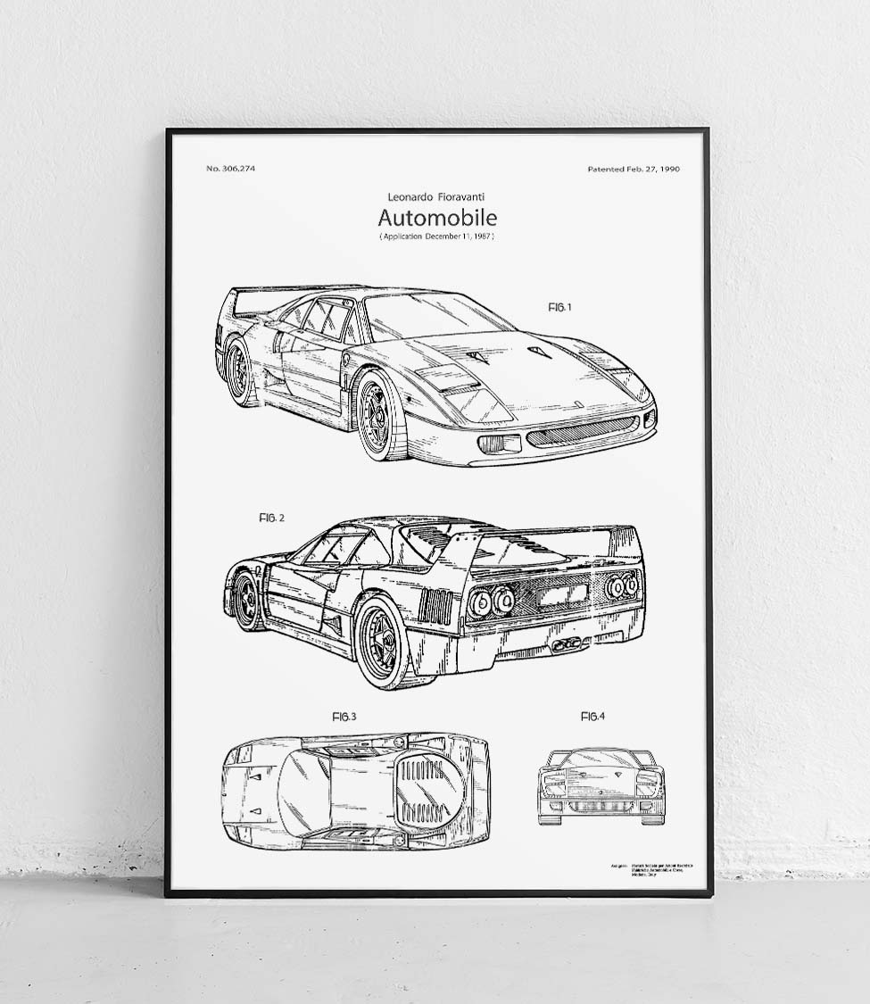 Plakat Ferrari F40 to reprodukcja patentu samochodu Ferrari F40 autorstwa Leonardo Fioravanti. Patent nr USD306274S został opublikowany w 1990 roku przez Urząd Patentów i Znaków Towarowych Stanów Zjednoczonych.