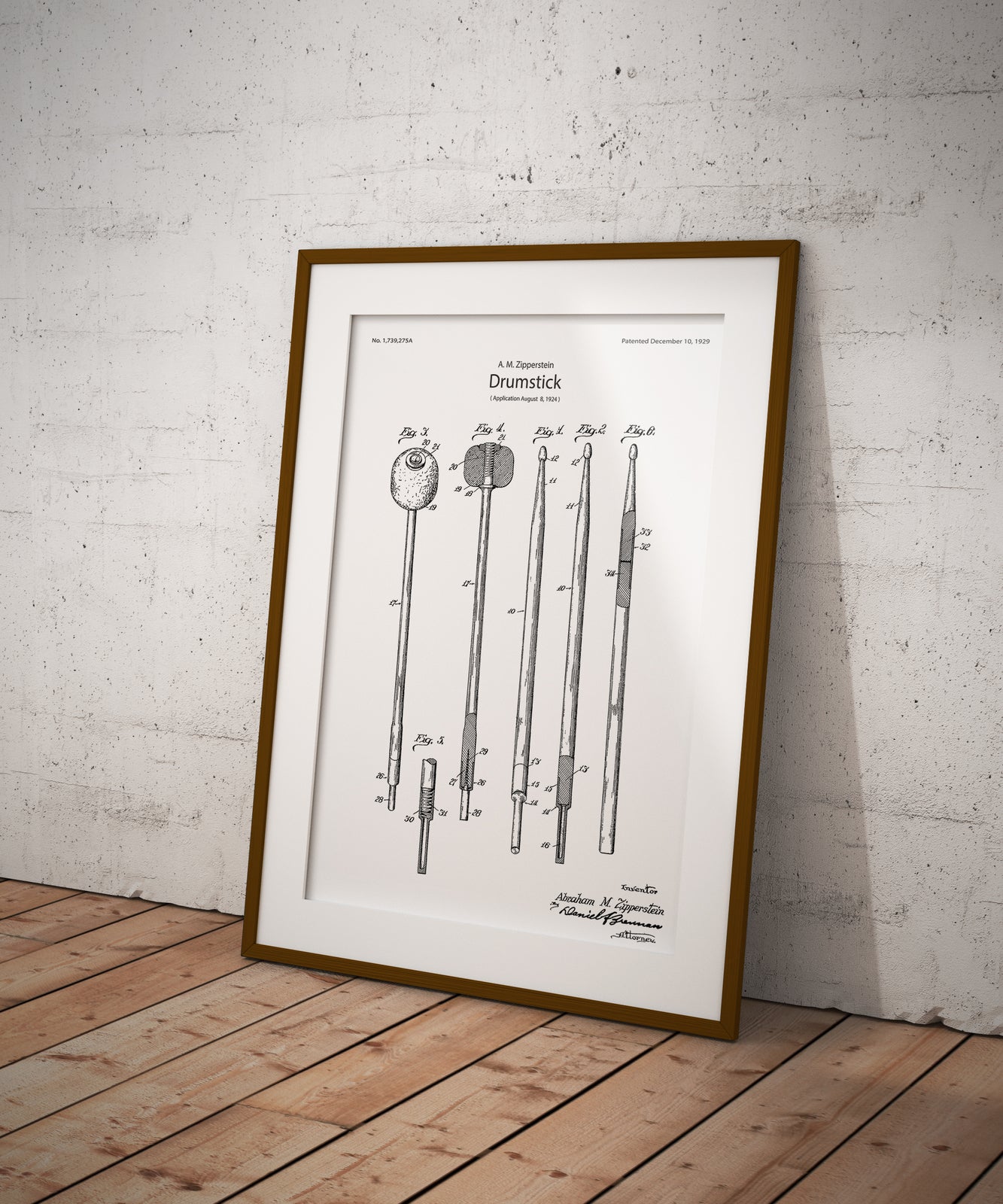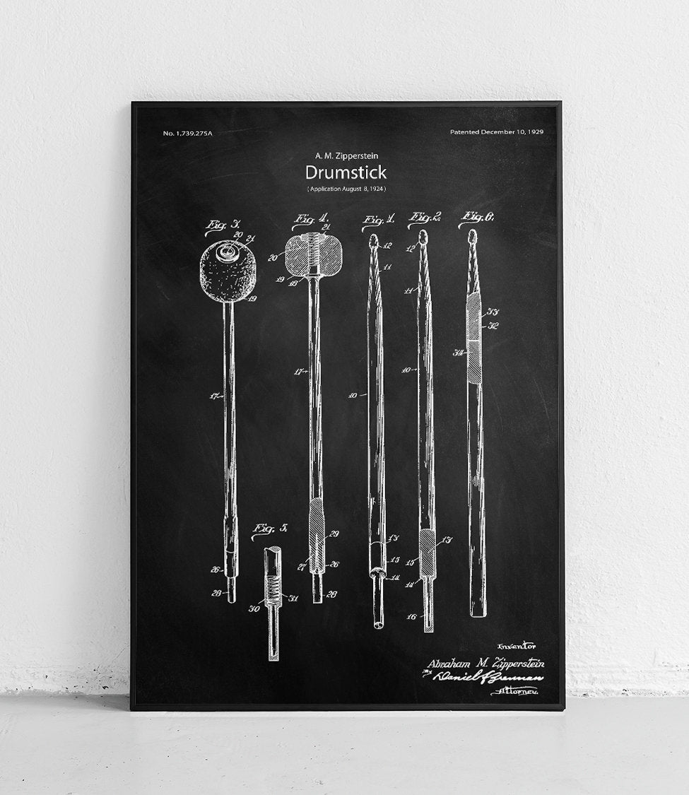 Plakat z reprodukcją patentu pałeczek do gry na perkusji autorstwa Abraham'a M. Zipperstein.