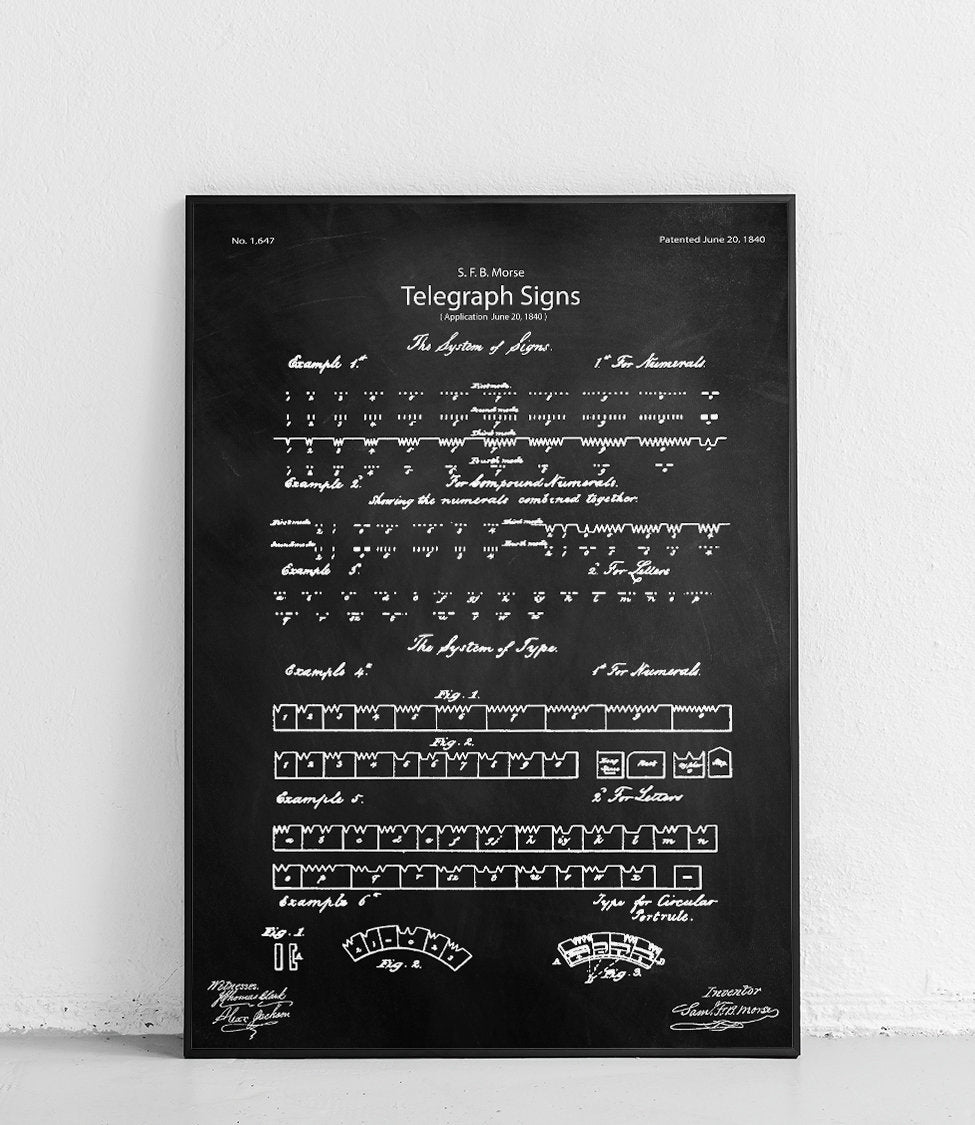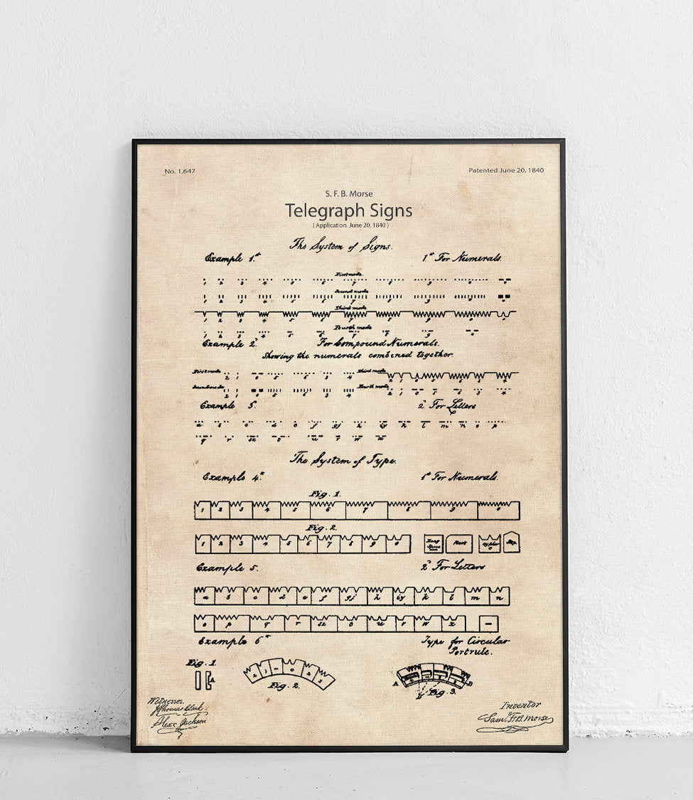 Plakat z reprodukcją patentu przedstawiającego alfabet Morse'a autorstwa Samuel'a Finley Breese Morse.