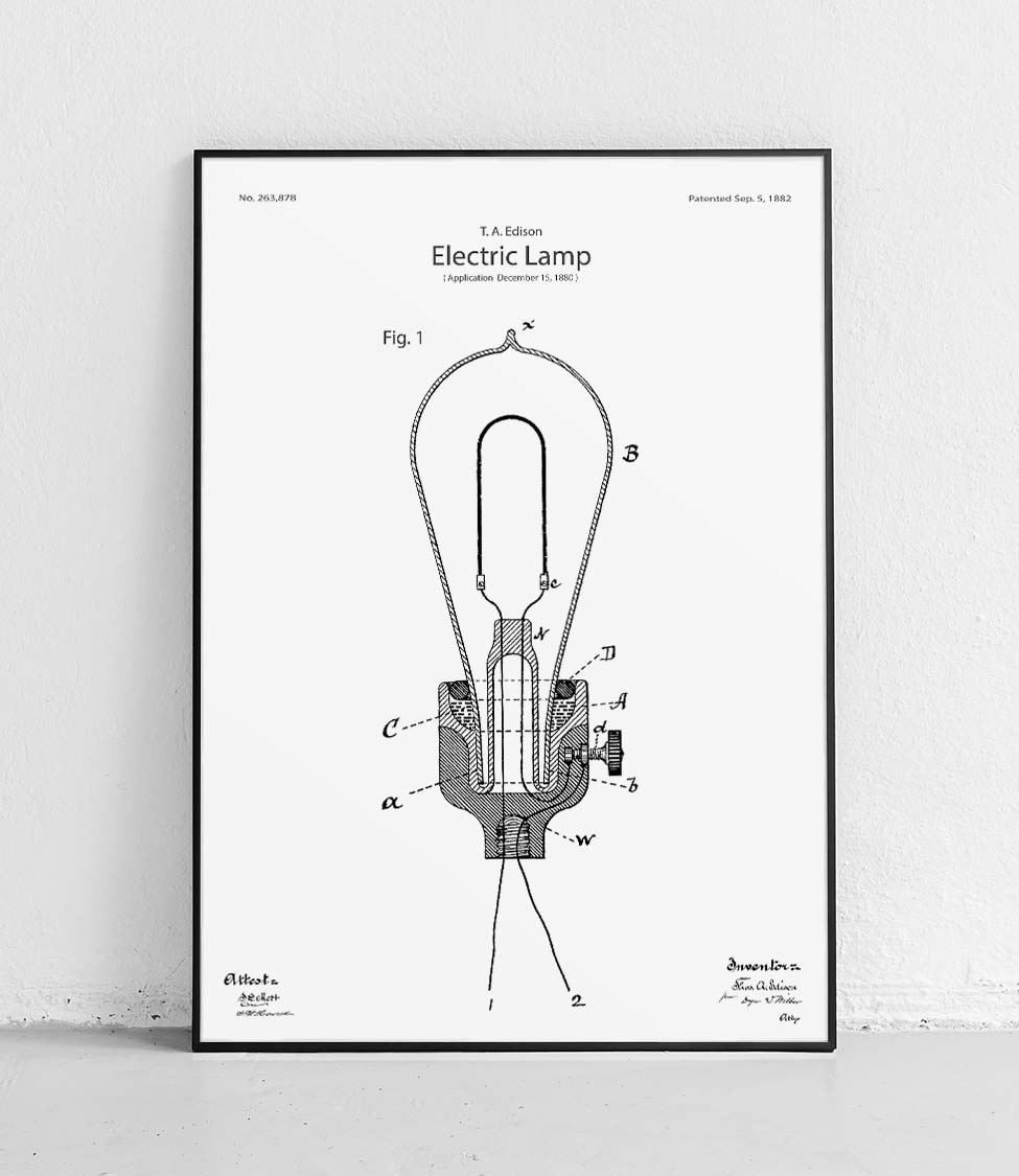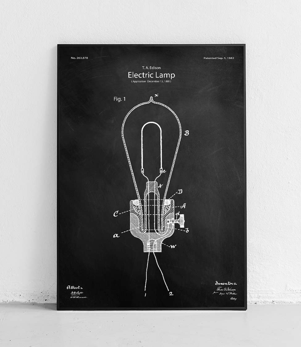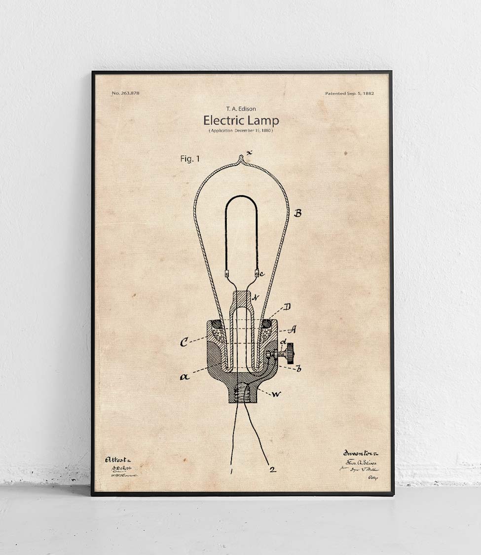 Plakat z reprodukcją patentu żarówki autorstwa Thomas'a Alva Edison.