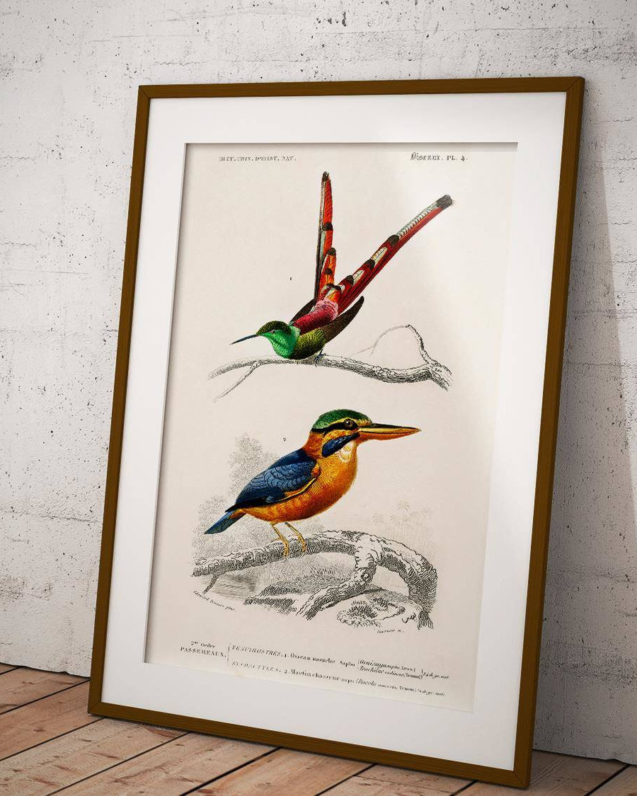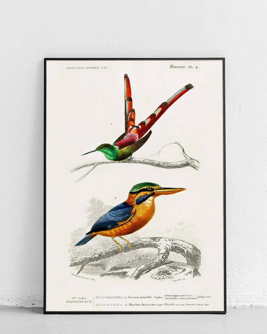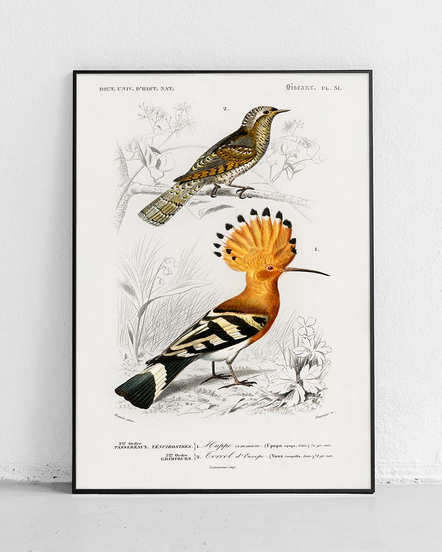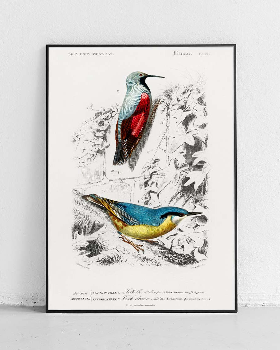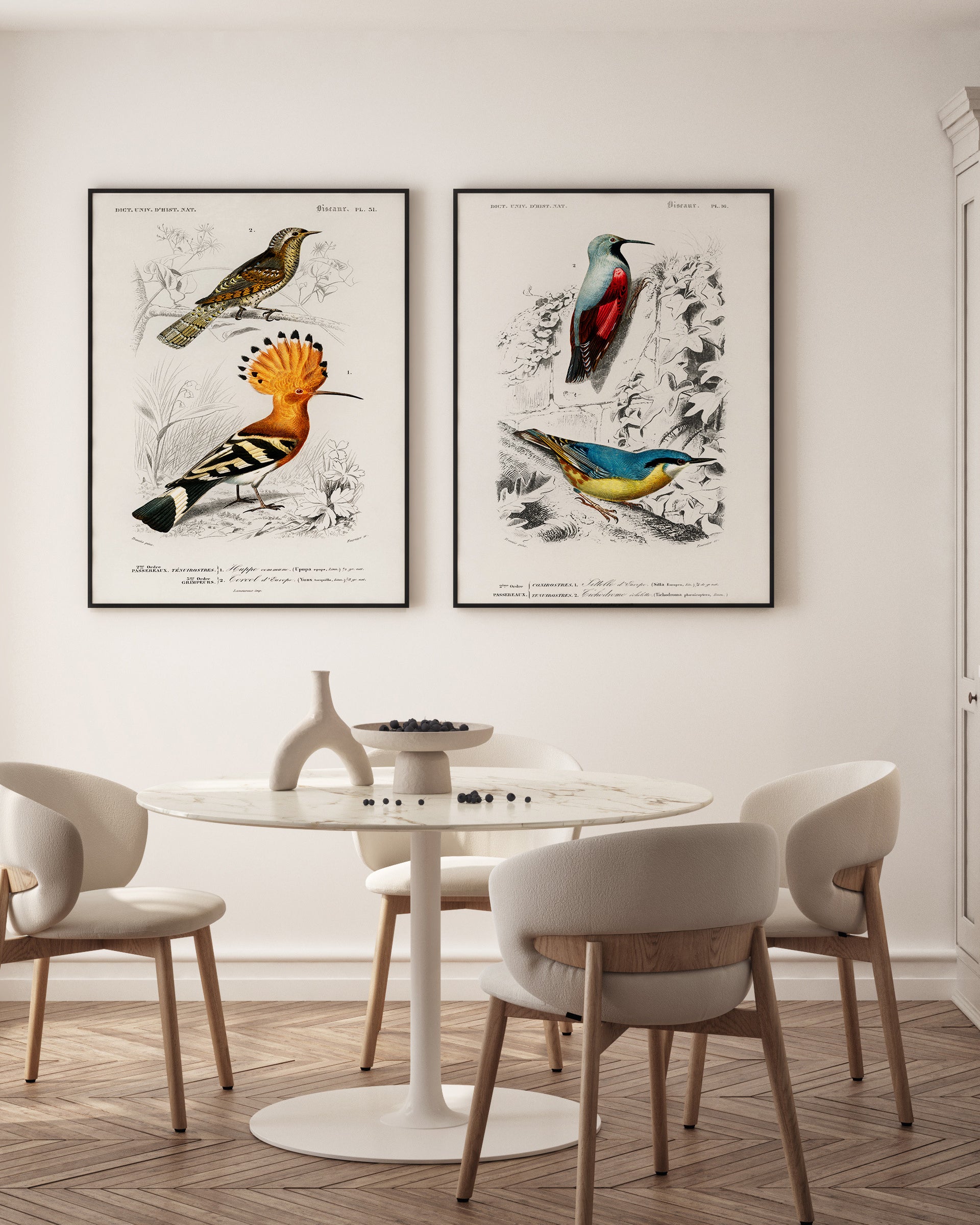 Kolekcja „Ptaki” prezentuje wybitne ilustracje dwóch znanych przyrodników – Charlesa d'Orbigny oraz François Levaillanta. Ich prace stanowią fundament nowoczesnej ornitologii i zachwycają zarówno precyzją naukową, jak i walorami artystycznymi. Plakaty w tej serii to nie tylko wyjątkowa dekoracja, ale także ukłon w stronę historii ilustracji przyrodniczej.