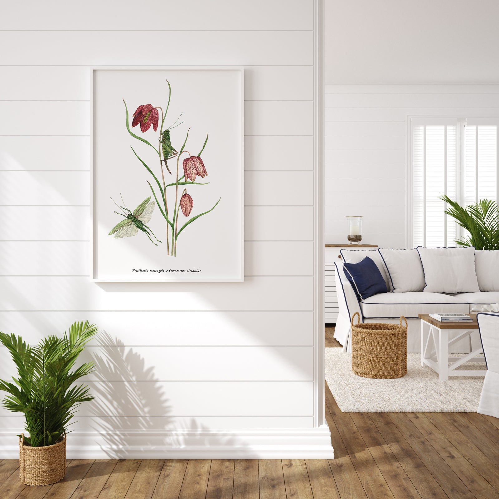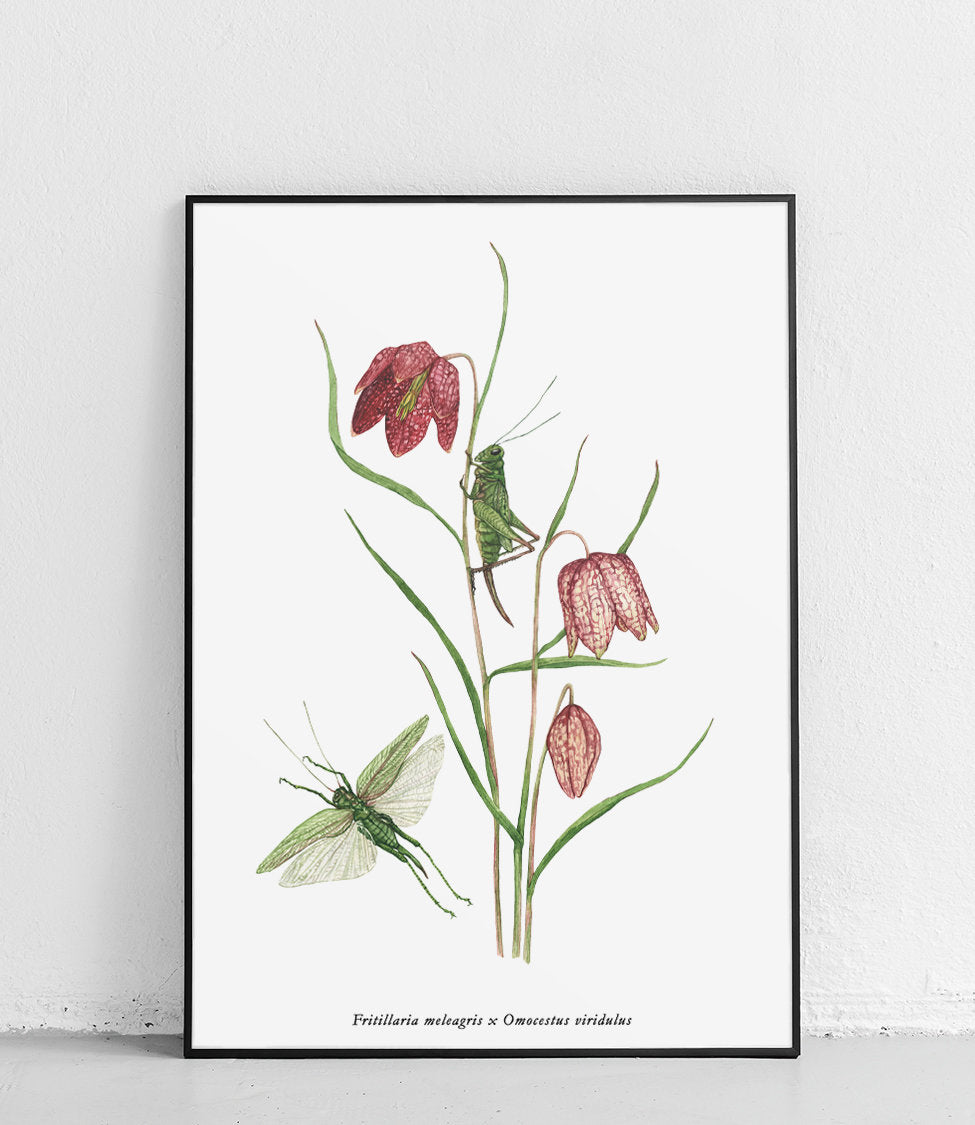 Plakat z serii “Krytycznie zagrożone rośliny w Polsce”  przedstawia szachownicę kostkowatą (Fritillaria meleagris L), tj. gatunek bylin należący do rodziny liliowatych.  Wpisana jest do Polskiej Czerwonej Księgi Roślin z oznaczeniem CR (krytycznie zagrożony). Tą mini serią chcemy przybliżyć przepiękne gatunki roślin w Polsce, które są krytycznie zagrożone. Dodatkowo chcemy pokazać je w sąsiedztwie występujących w naszym kraju owadów, ukazując piękno ich życia w symbiozie. Ten plakat, jak i cała seria, został namalowany specjalnie na nasze zamówienie przez artystkę Annę Farbę. Po wykonaniu malunku, plakat jest cyfrowo skanowany, a potem drukowany na naszych najwyższej jakości papierach.