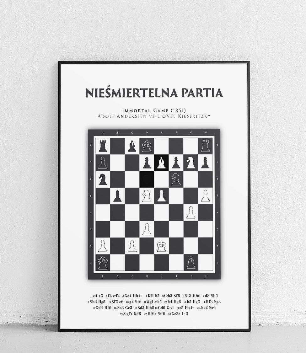 Plakat z "Nieśmiertelną partią" (Immortal Game) rozegraną między Adolfem Anderssenem i Lionelem Kieseritzkim. Partia ta jest jedną z najbardziej znanych partii w historii szachów!