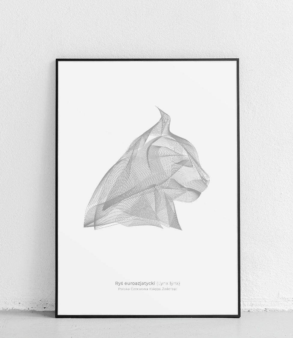 Plakat przedstawiający szarego rysia euroazjatyckiego na białym tle.