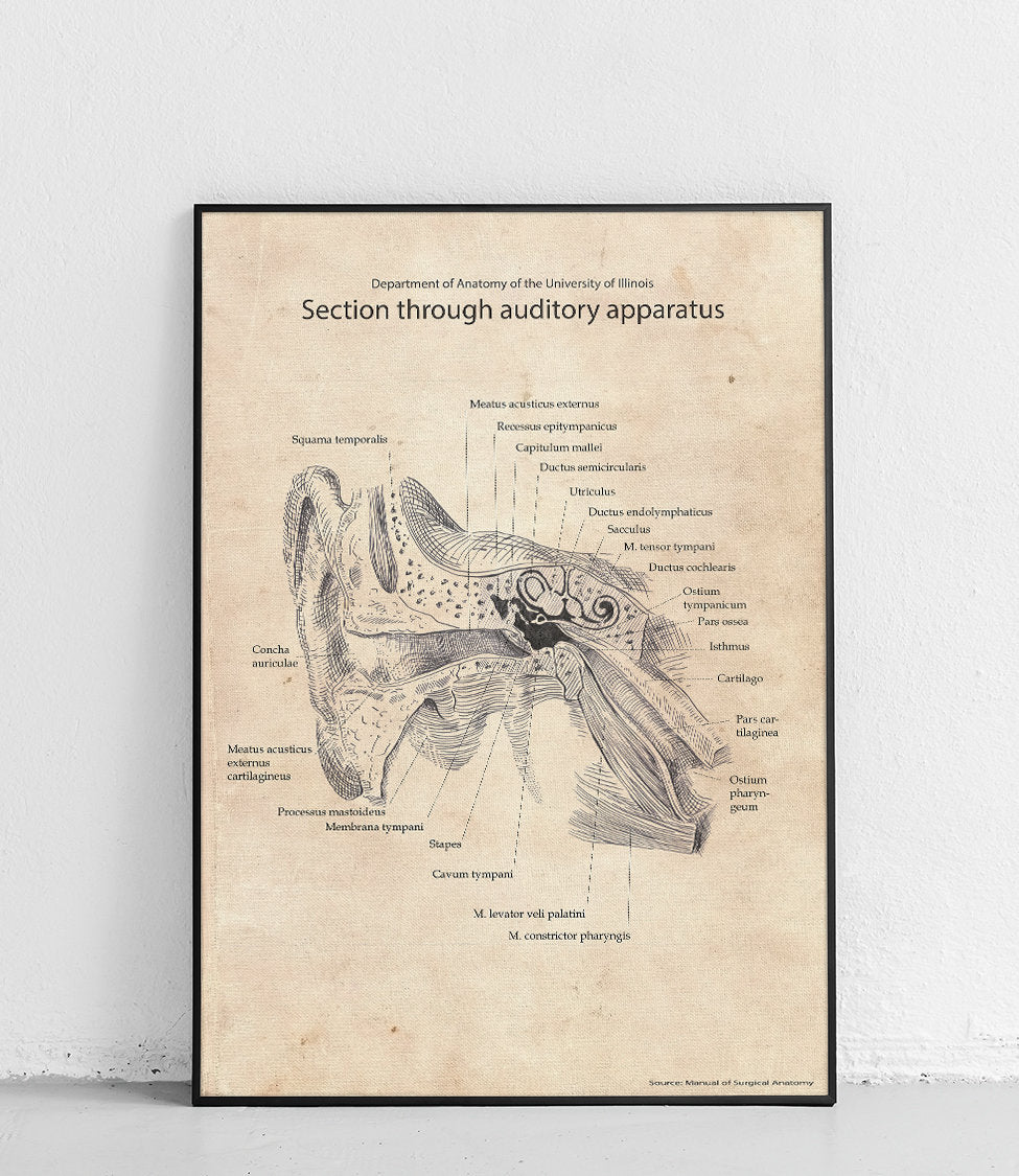 Poster mit dem anatomischen Diagramm des Hörgeräts. Perfekt für Medizinstudenten und Angehörige der Gesundheitsberufe. Die Beschreibungen sind in Latein.
