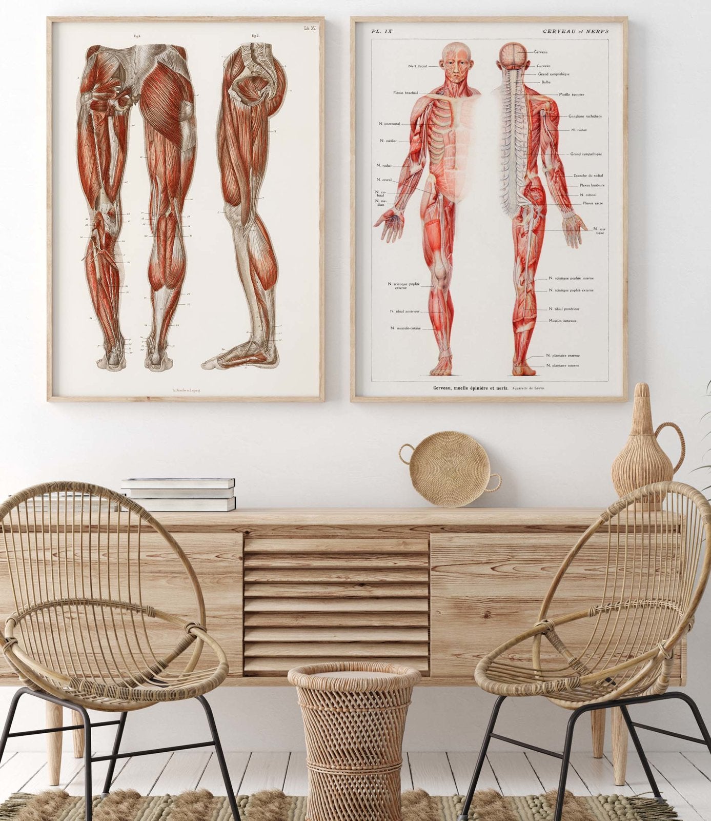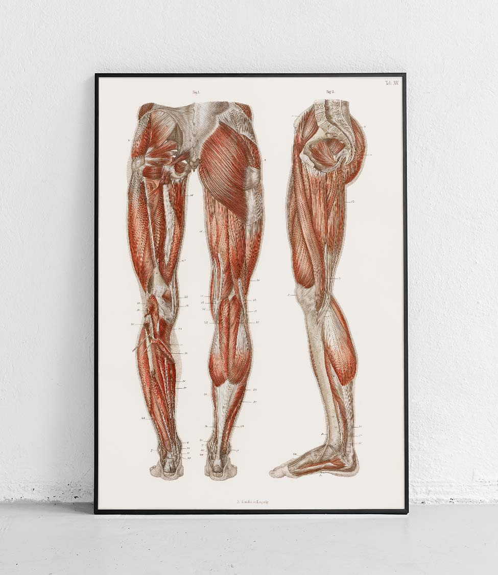 Poster mit anatomischen Details der Bein- und Fußmuskulatur. Perfekt für Medizinstudenten und Anatomie-Enthusiasten.