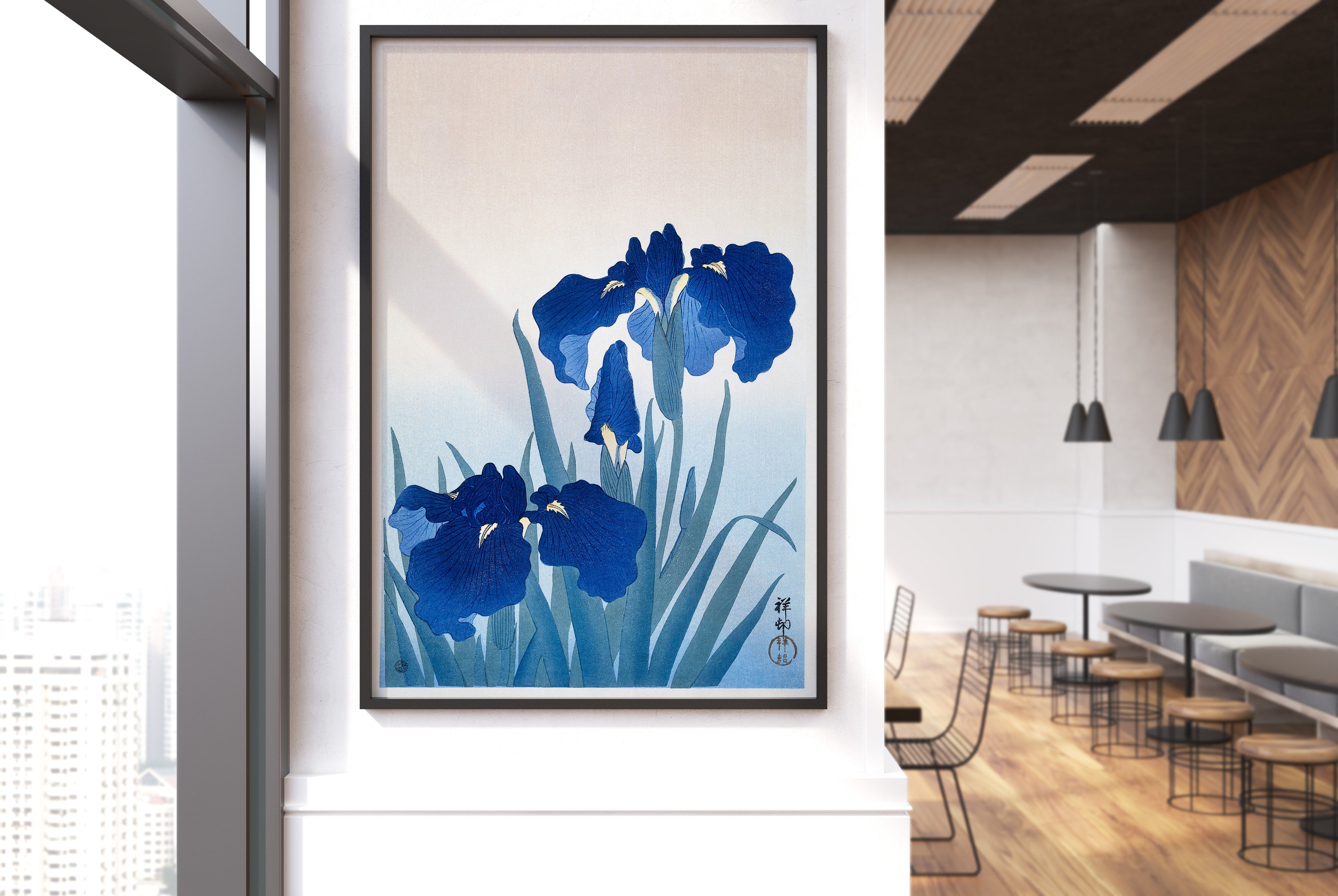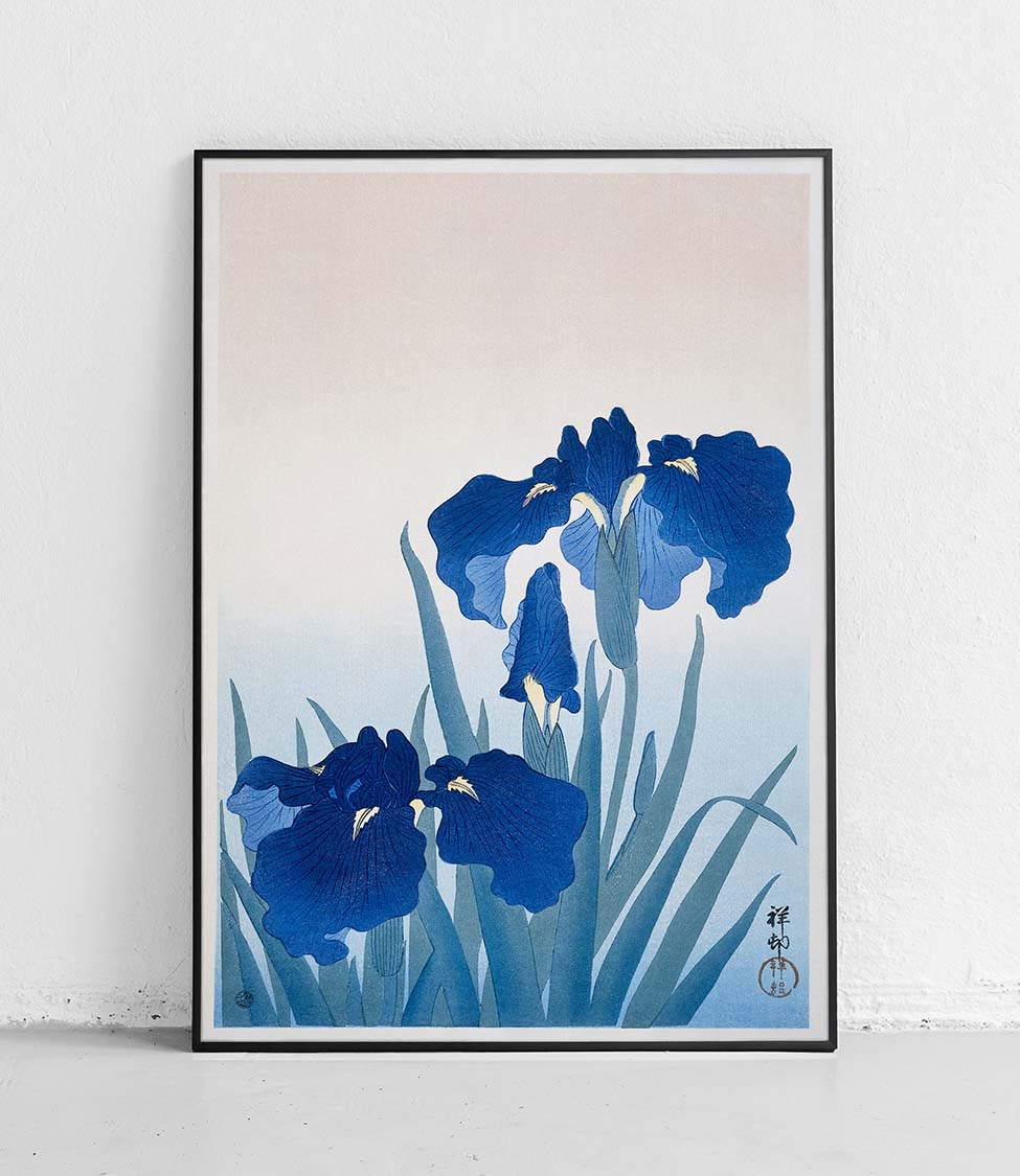Die beigefügte Grafik zeigt „Blaue Schwertlilien“. Die Illustration stammt von Ohara Koson, einem japanischen Maler und Grafiker der Wende vom 19. zum 20. Jahrhundert.