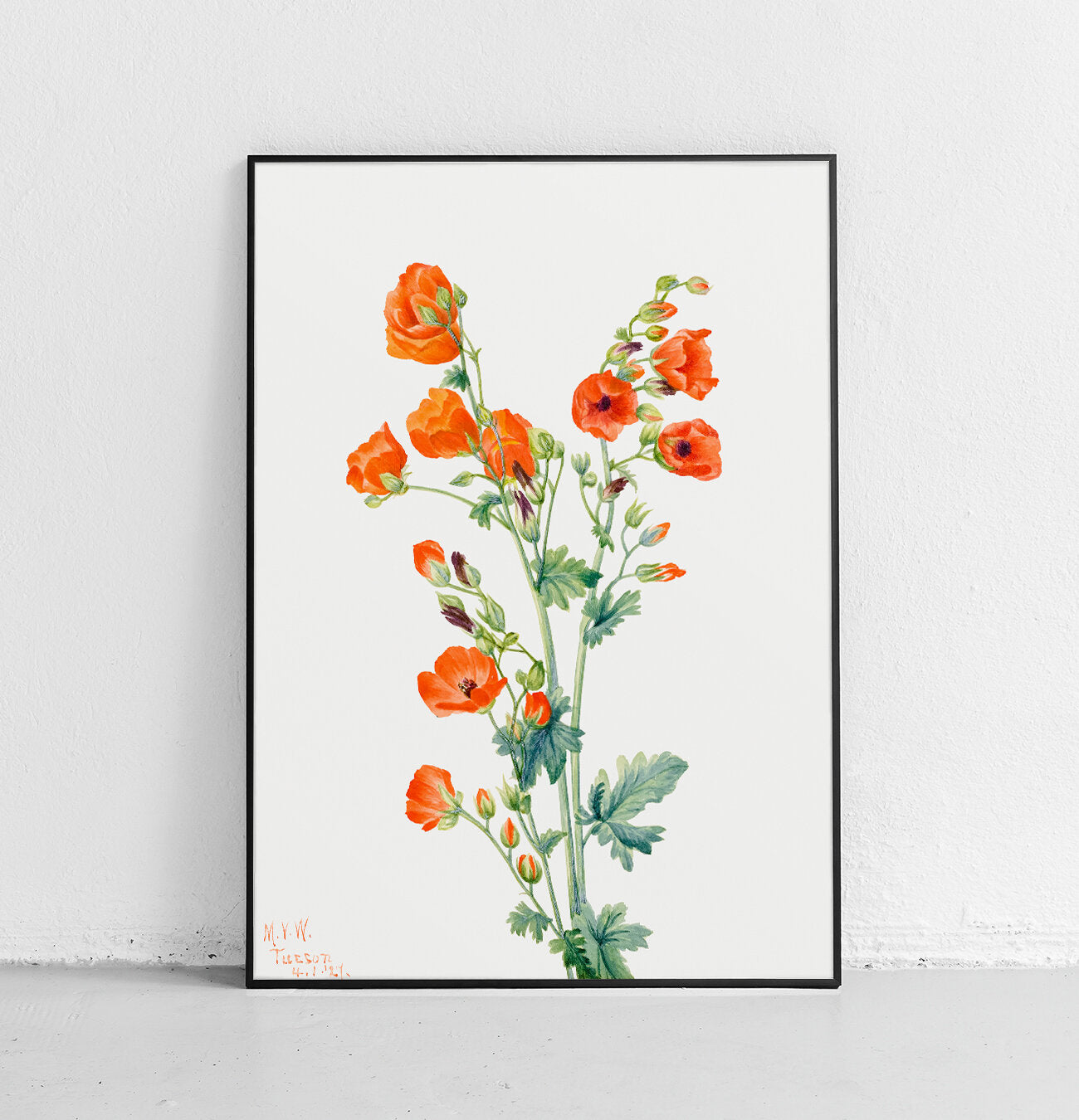 Wunderschöne Illustrationen von Stockrosen (Sphaeralcea grossulariaefolia) von Mary Vaux Walcott (1860-1940). Mary liebte es schon in jungen Jahren, Blumen zu malen, und auf Reisen in die Rocky Mountains entdeckte sie ihre Leidenschaft für Botanik und Malerei.
