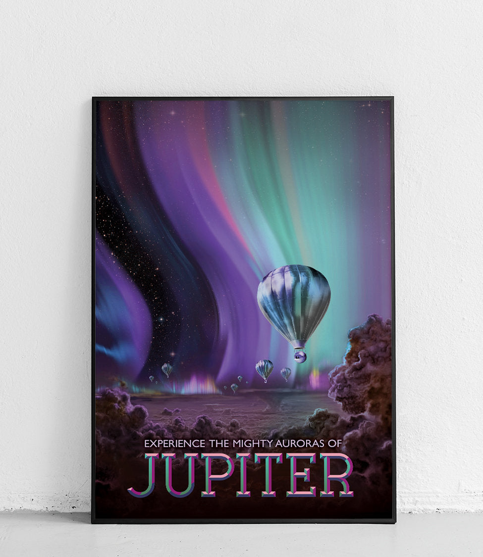 Dieses Originalposter stammt aus der „Visions of the Future“-Reihe der NASA. Es stellt die Idee der Raumfahrt und ferner Planeten dar.