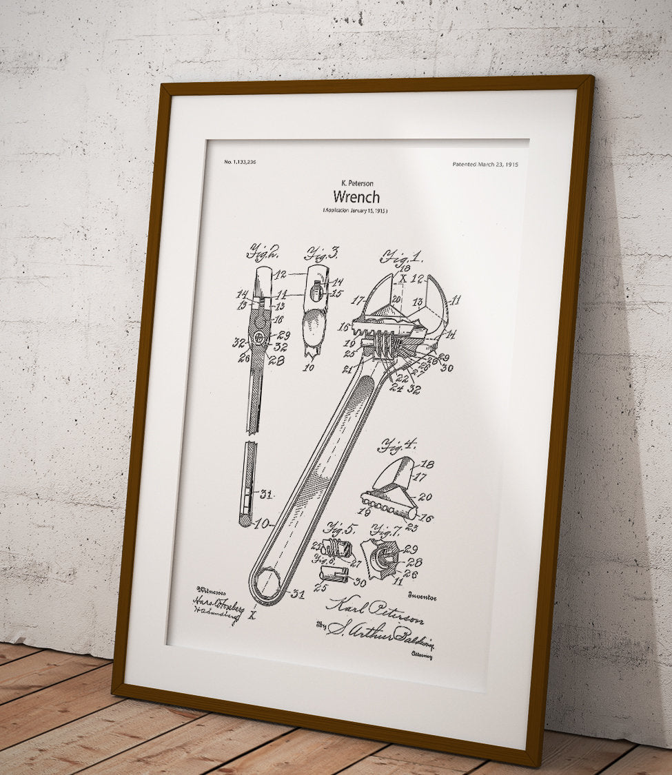 Das Poster zeigt einen verstellbaren Schraubenschlüssel in stilvollem Schwarzweiß. Perfekt für Werkzeug- und Heimwerker.