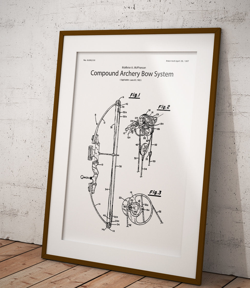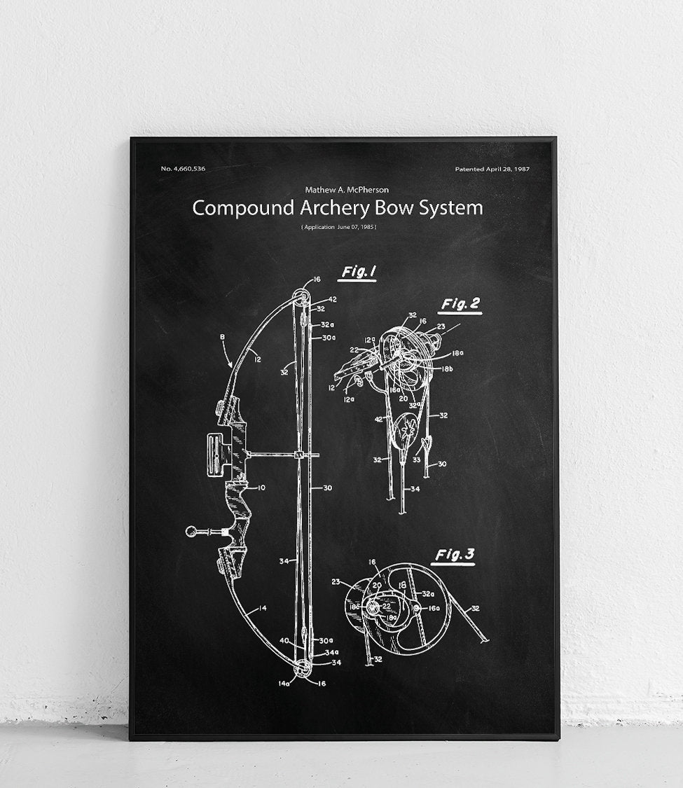 Ein Poster mit der Abbildung eines Compoundbogens, perfekt für Liebhaber von Erfindungen und Technologie.