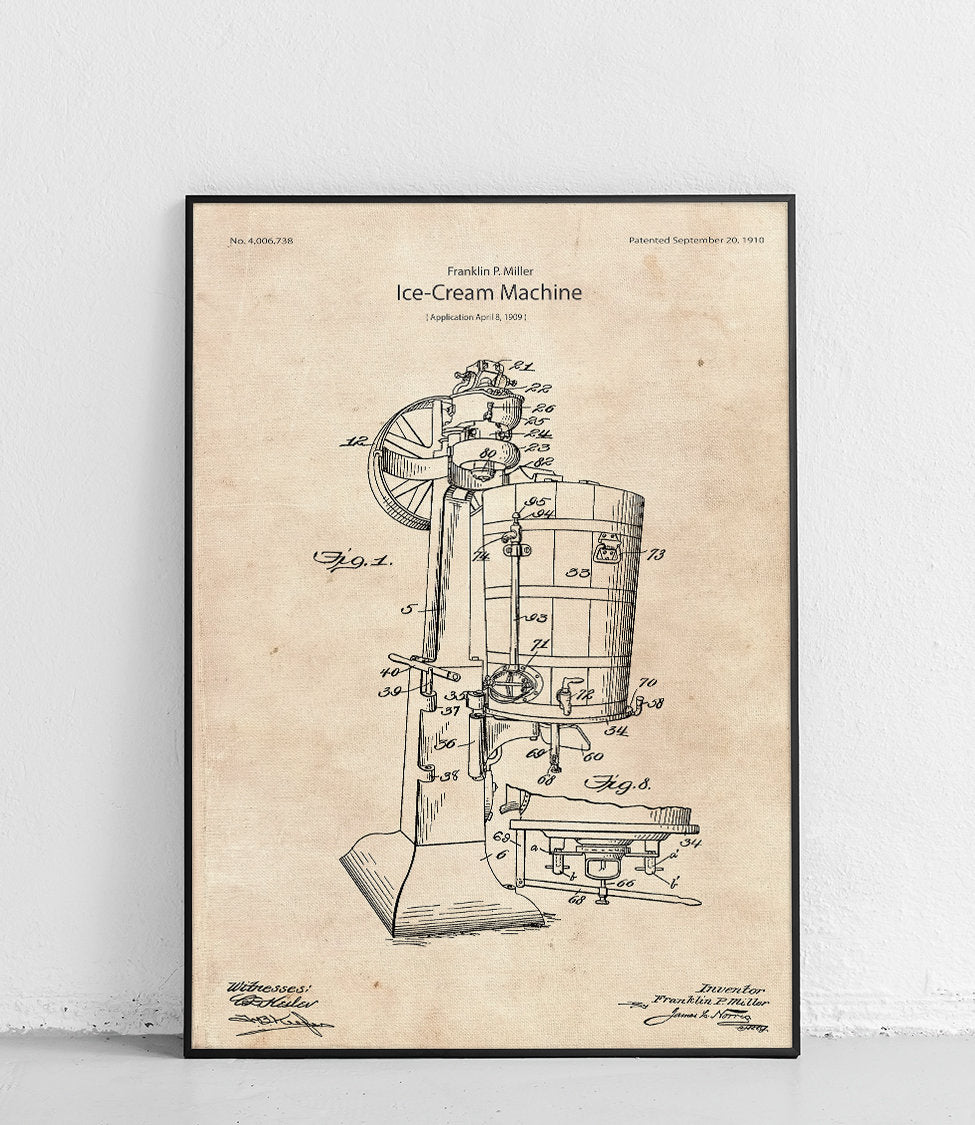 Ein Poster, das ein Patent für eine Eismaschine von Franklin P. Miller reproduziert.