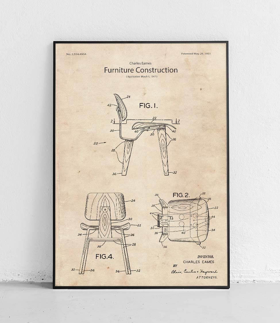 Patent-Reproduktionsposter des Eames LCW Chair von Charles Eames. Das Patent Nr. US2554490A wurde 1951 vom US-Patent- und Markenamt veröffentlicht.