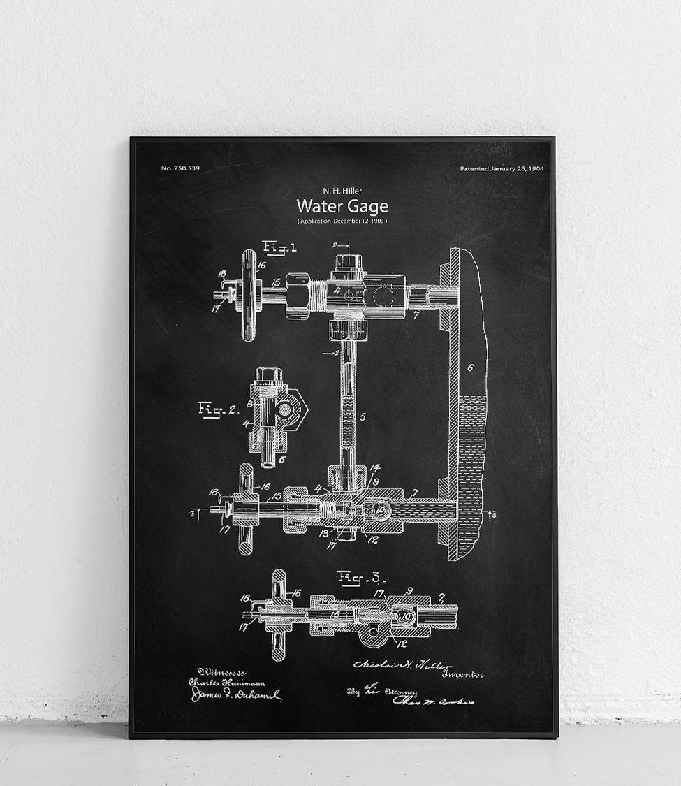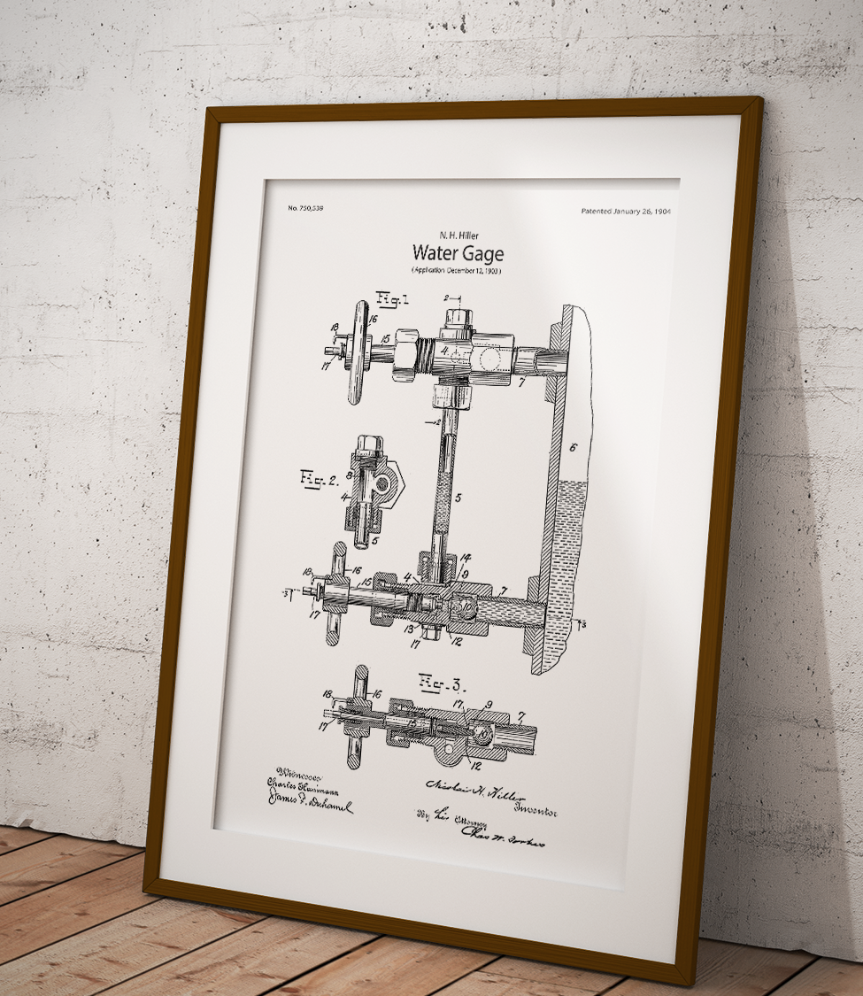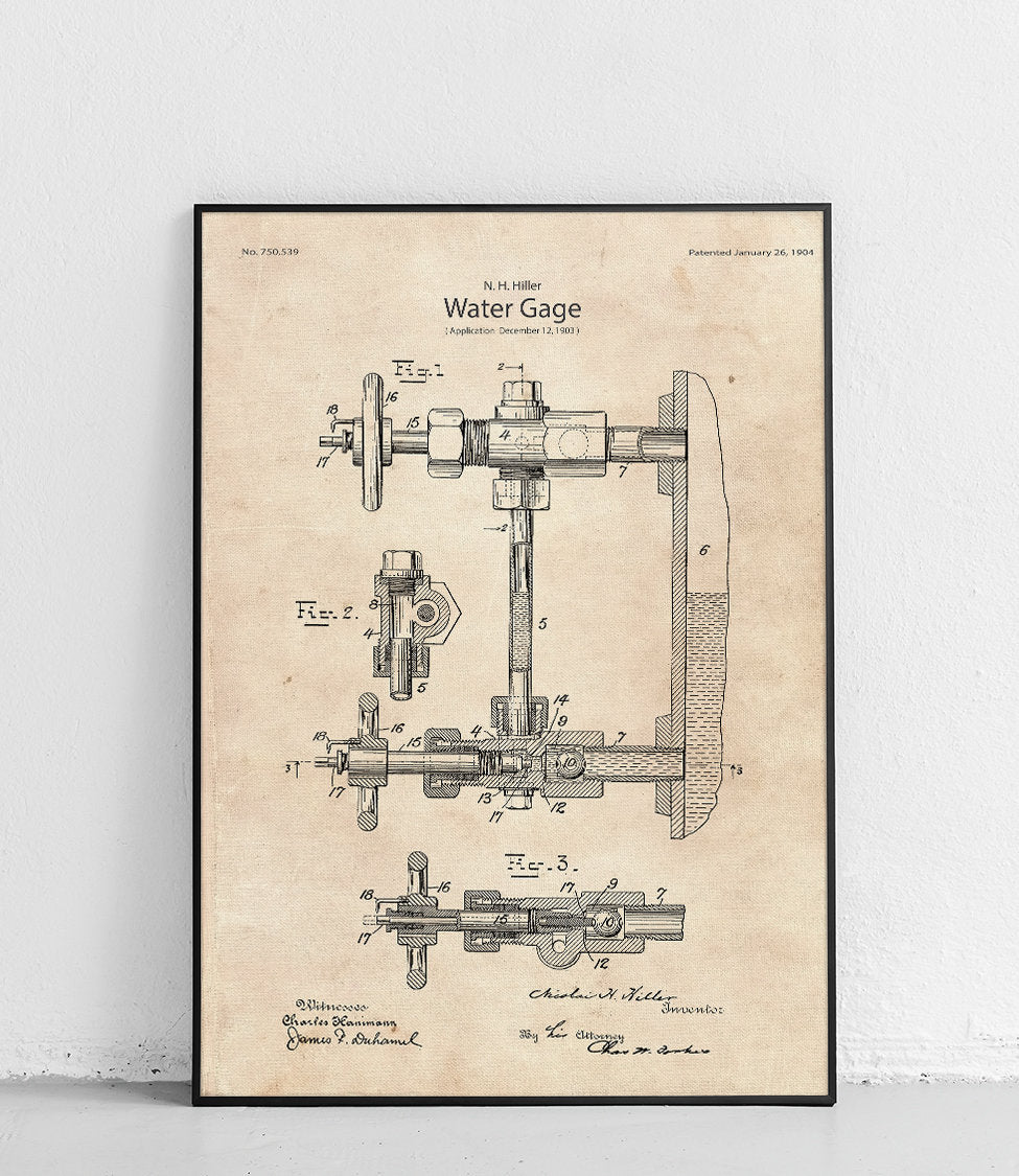 Ein Poster mit der Abbildung eines Wasserzählers, perfekt für Liebhaber von Erfindungen und Technikgeschichte.