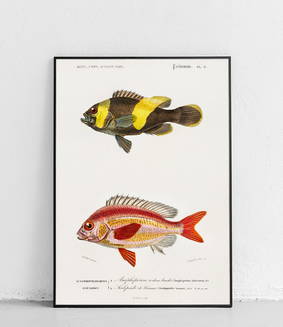 Ein wunderschönes Poster mit farbenfrohen Fischen aus der Familie der Fadenfische und Clownfische. Perfekt für Liebhaber der Unterwasserwelt.