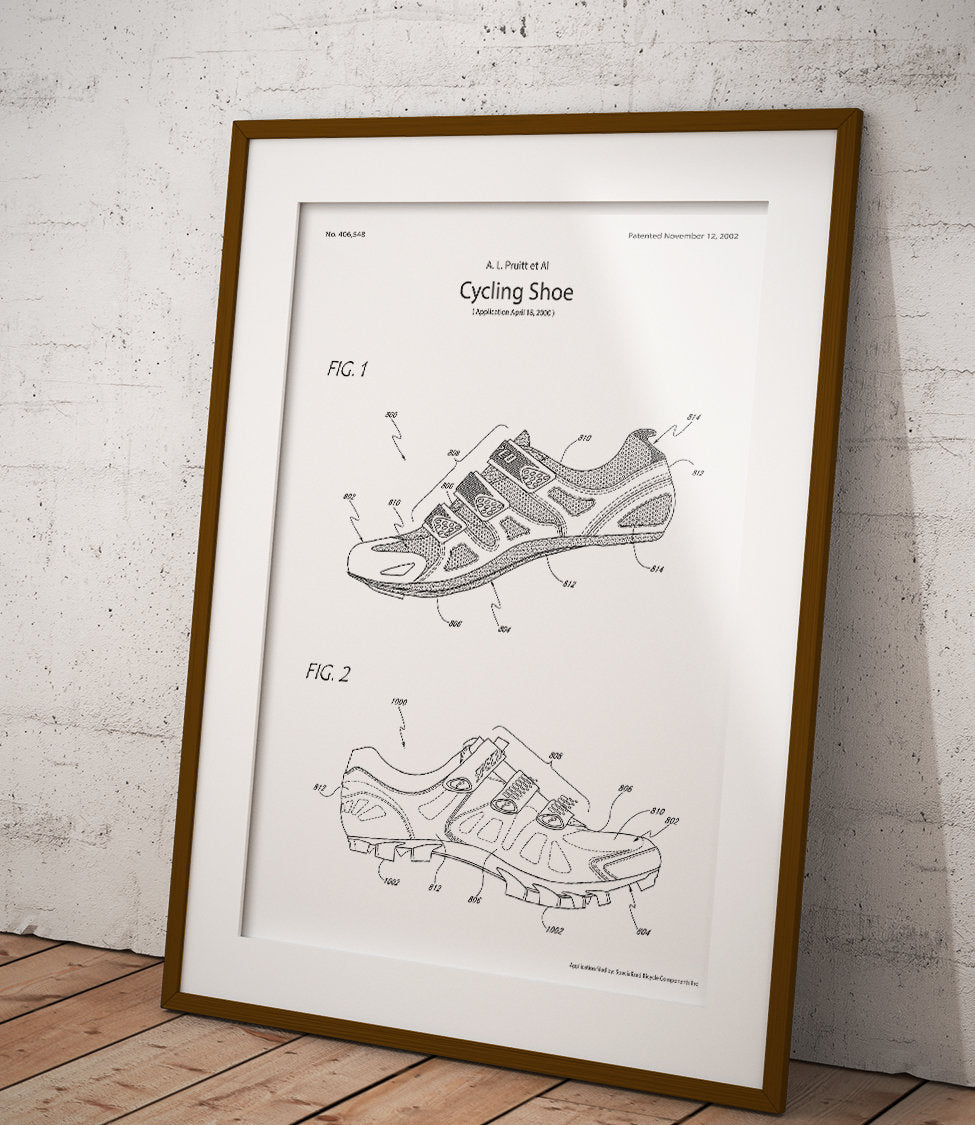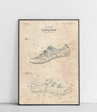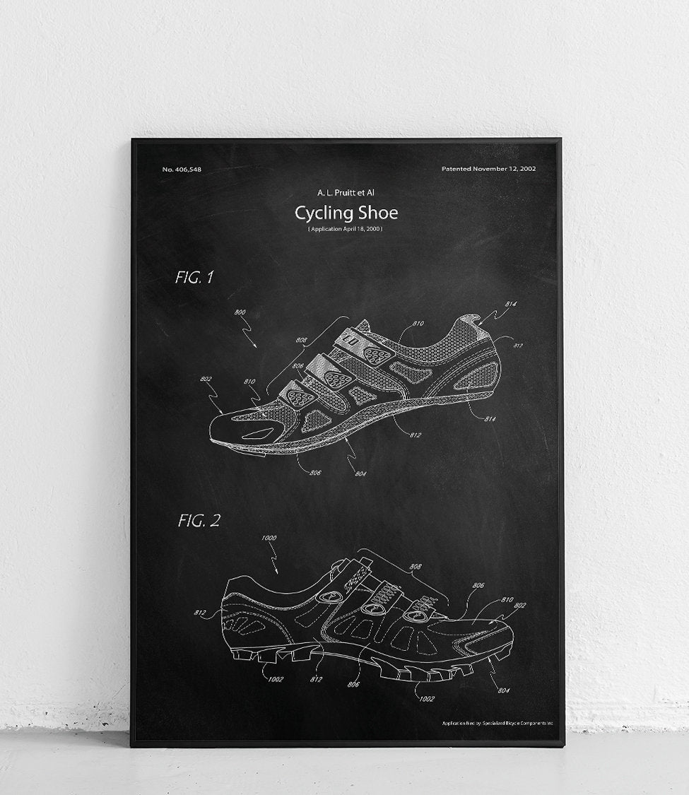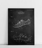 Ein Poster mit Fahrradschuhen, perfekt für Radsportbegeisterte. Es ist hochwertig verarbeitet und präsentiert verschiedene auf dem Markt erhältliche Schuhmodelle.