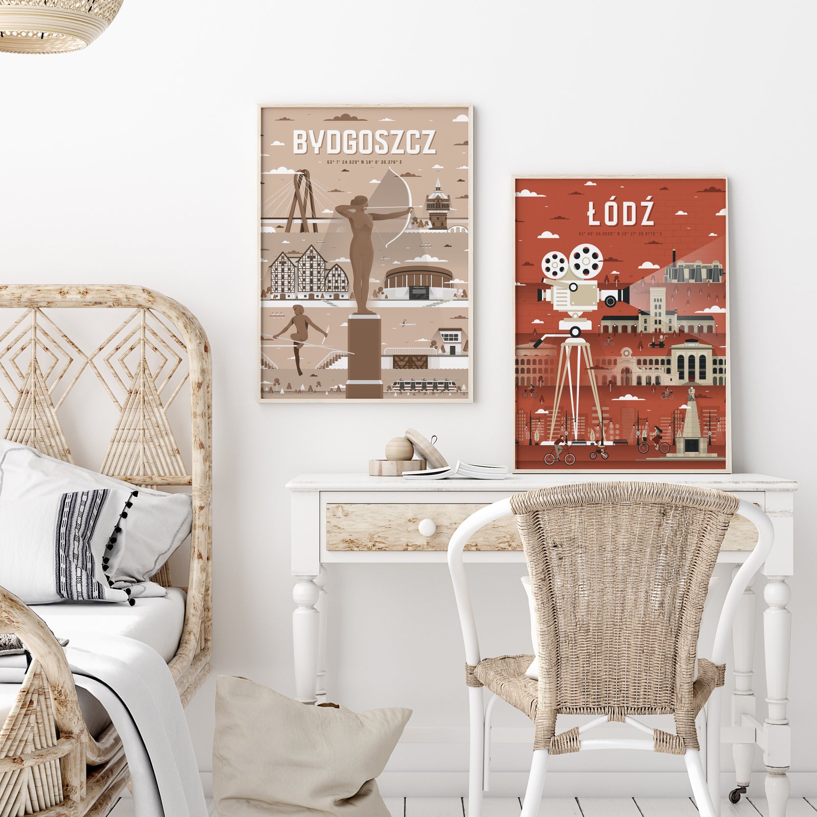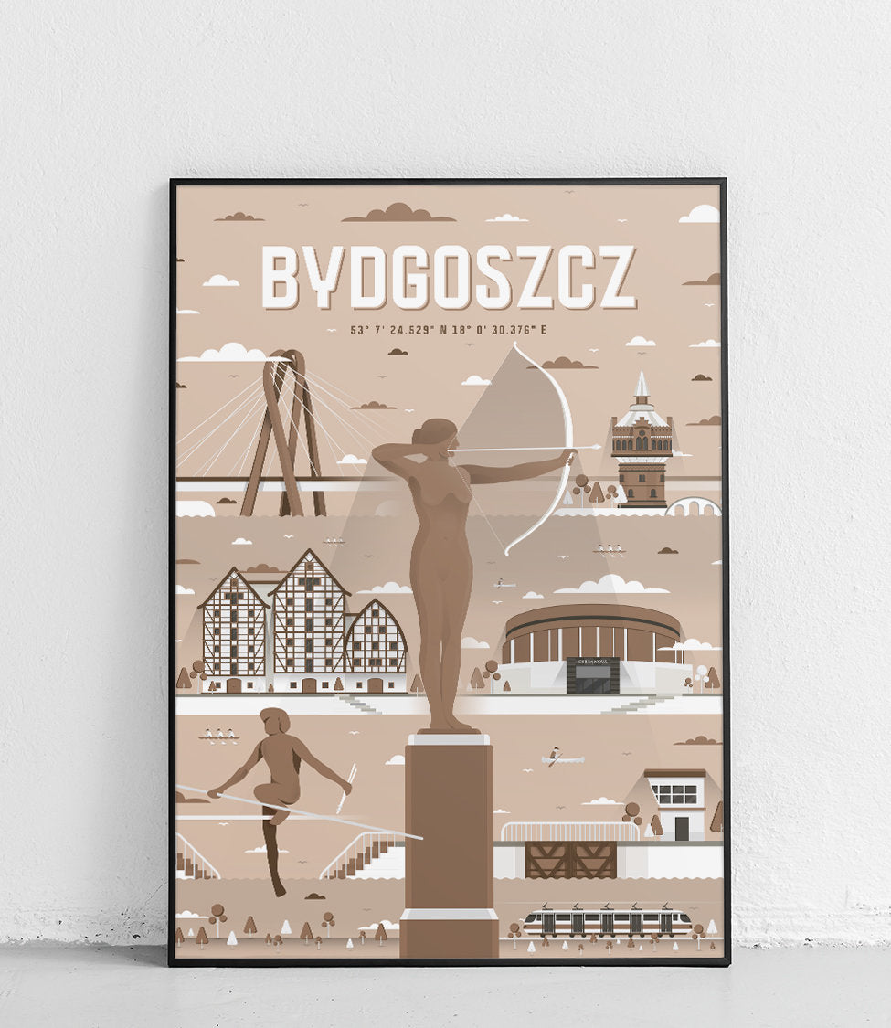 Das Poster zeigt berühmte Wahrzeichen von Bydgoszcz: das Bogenschützendenkmal, die Skulptur „Überquerung des Flusses“, die Getreidespeicher von Bydgoszcz, die Opera Nova, den Wasserturm und die Universitätsbrücke.