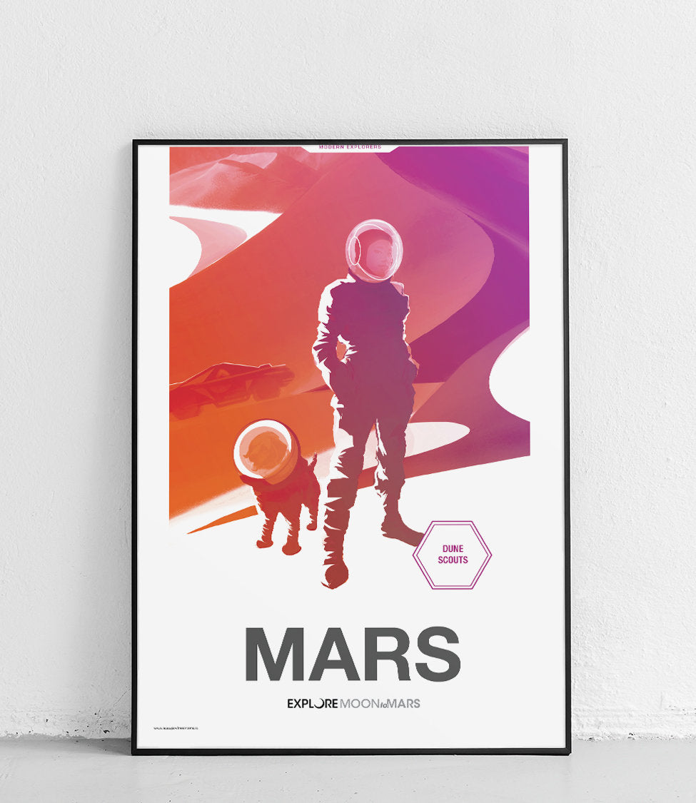 Dieses Originalposter stammt aus der Modern Explorers Collection der NASA und feiert die Pläne der NASA, zum Mond zurückzukehren und dann zum Mars zu fliegen.