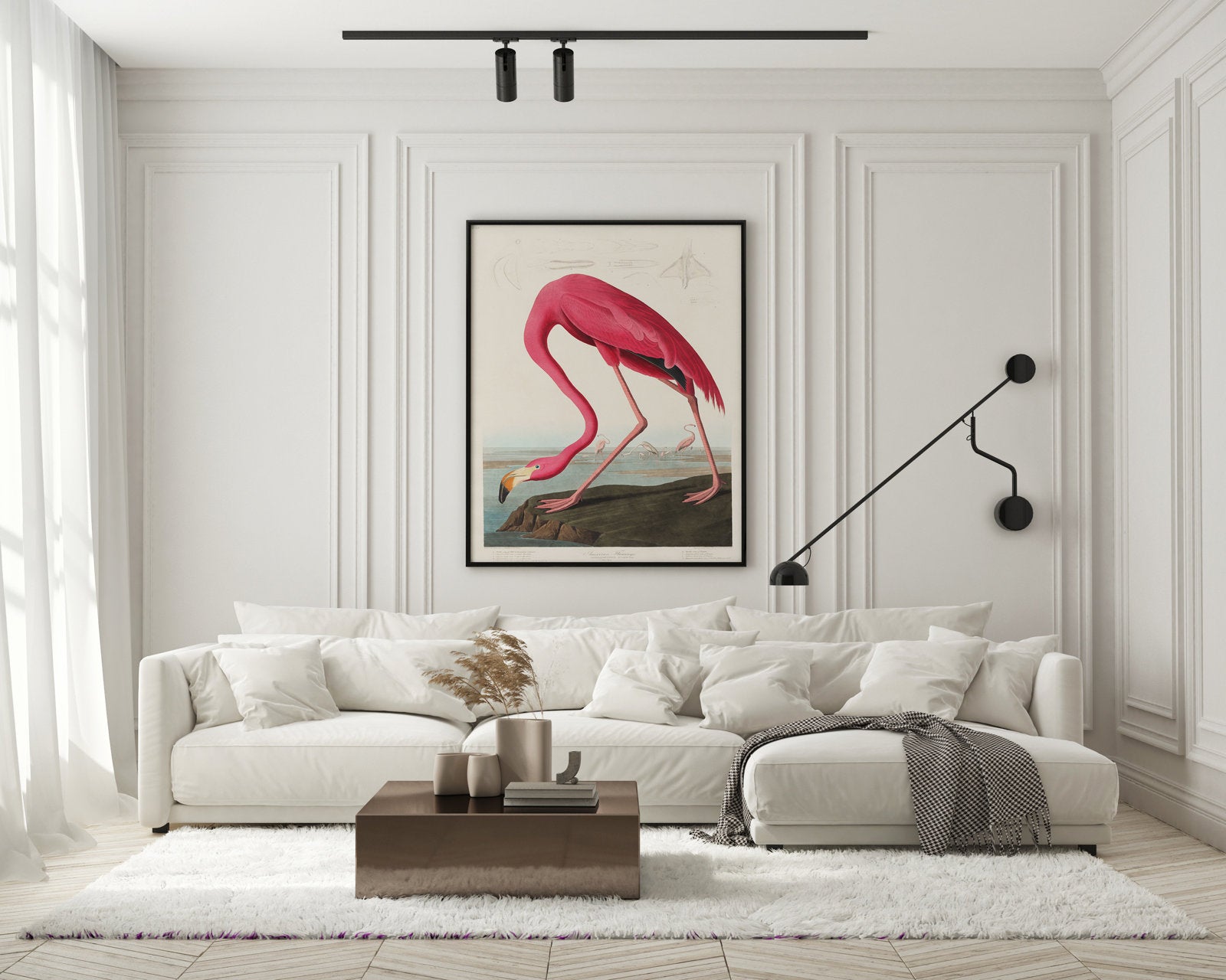 Diese Originalillustration zeigt einen „Rosaflamingo“, eine Art großer Watvögel aus der Familie der Flamingos (Phoenicopteridae).