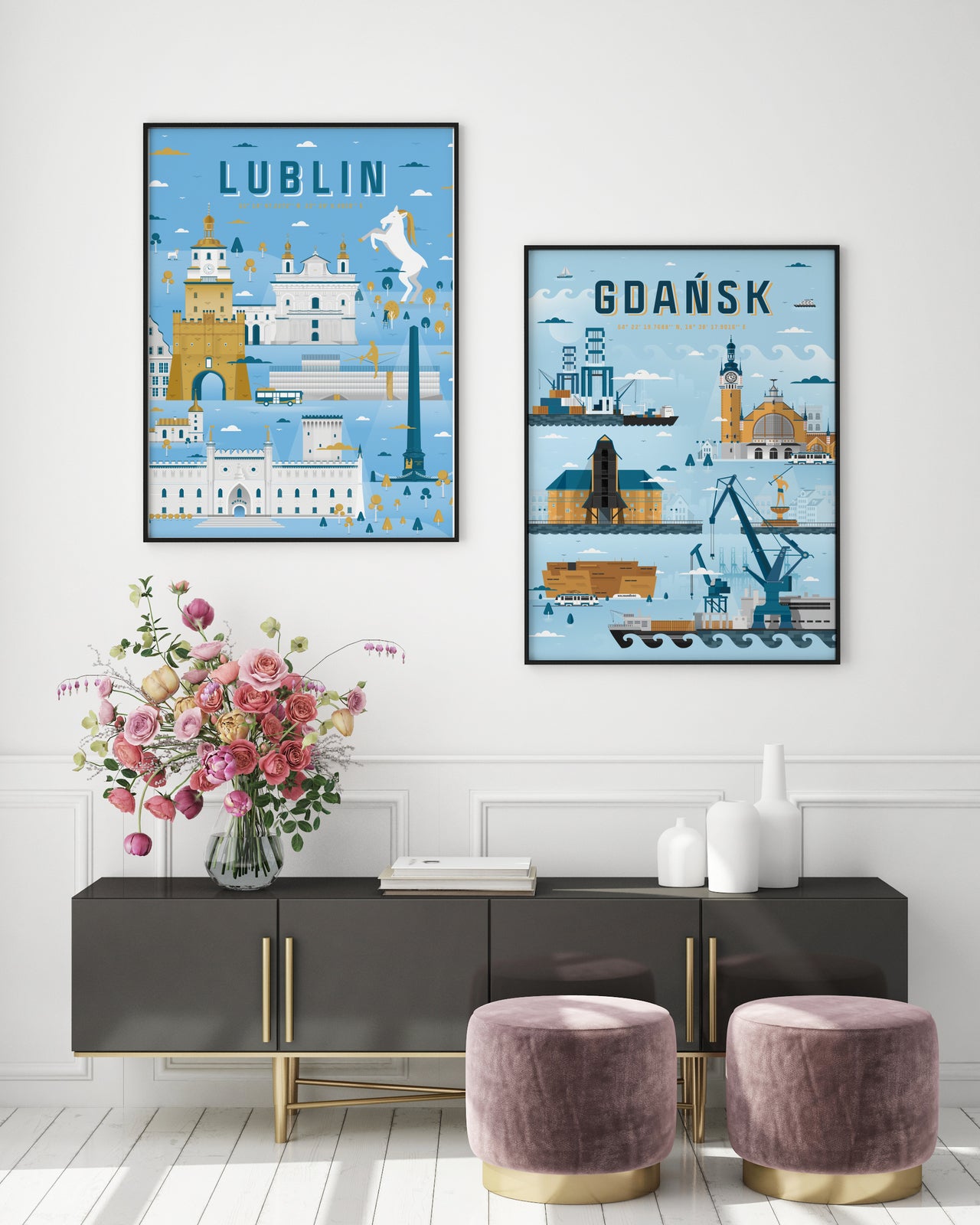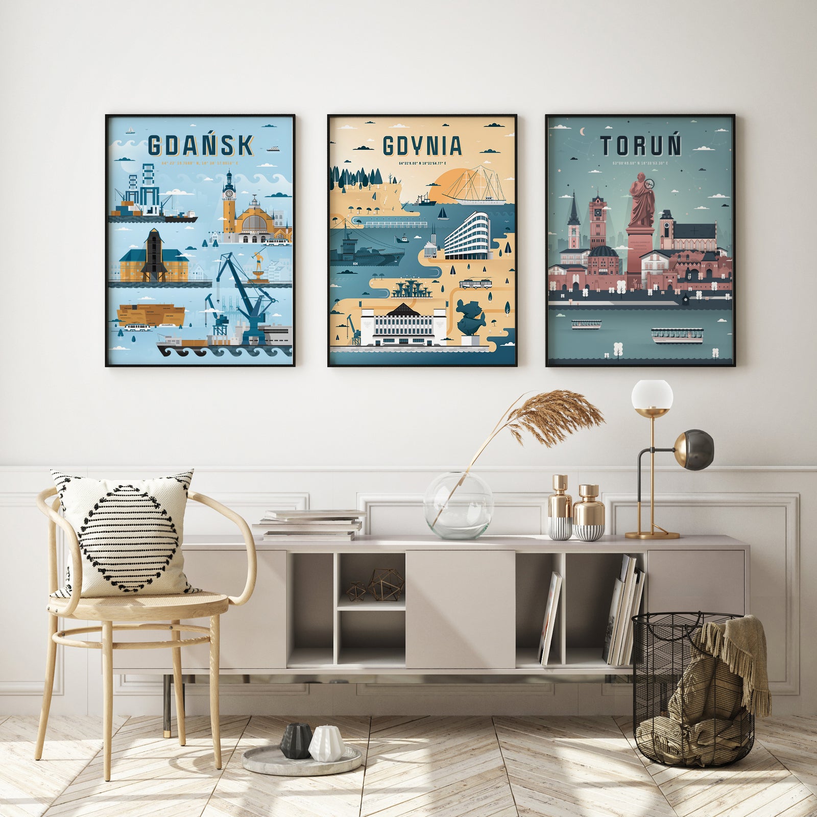 Das Poster zeigt die größten Wahrzeichen von Danzig, darunter: Hauptbahnhof, Kran, Neptunbrunnen, ECS, Containerterminal.