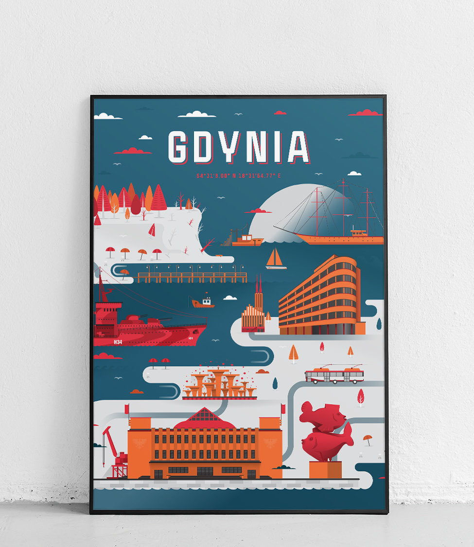 Das Plakat zeigt die Wahrzeichen von Gdynia, darunter: Orłowski-Klippe, Pier, ORP Błyskawica, Dar Pomorza, Marinestation, Rybek-Denkmal und den Brunnen auf dem Kościuszko-Platz.