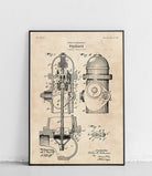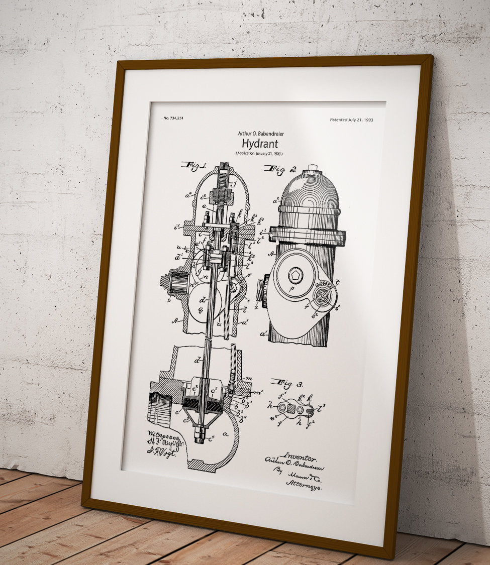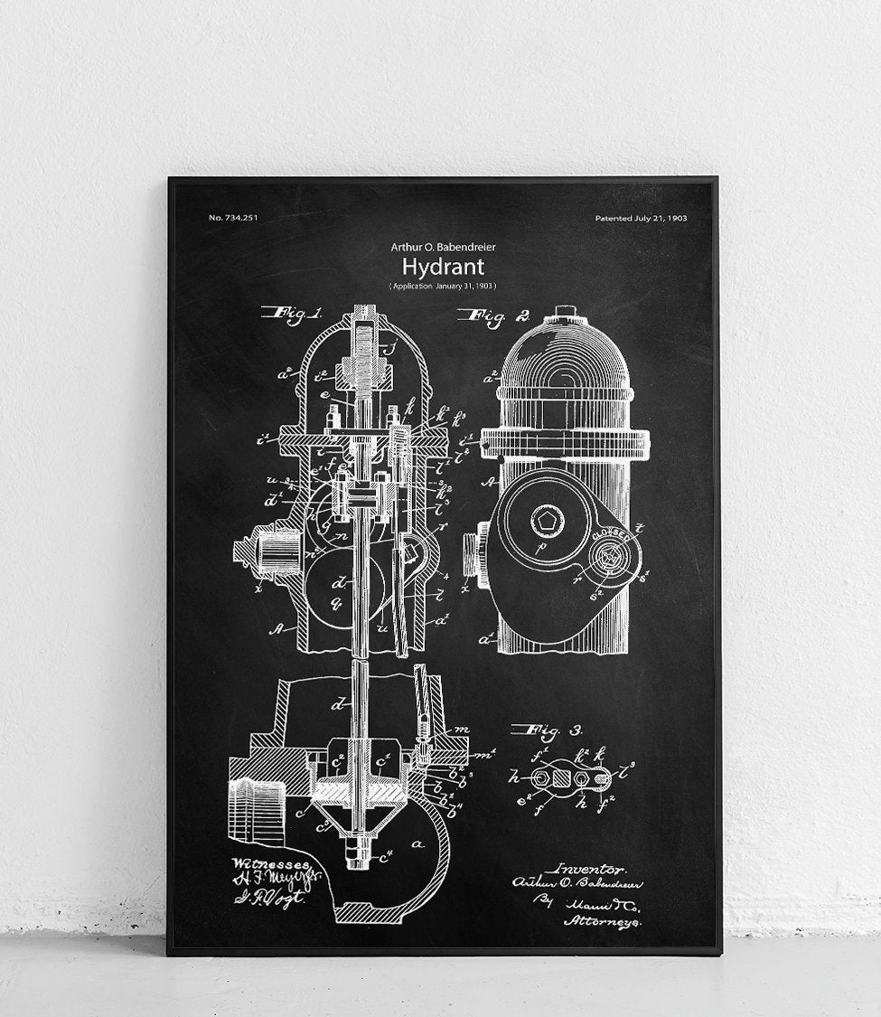 Ein einzigartiges Poster, das einen Hydranten im Patentstil darstellt. Perfekt für Liebhaber des Industriedesigns und Fans origineller Wohnaccessoires.
