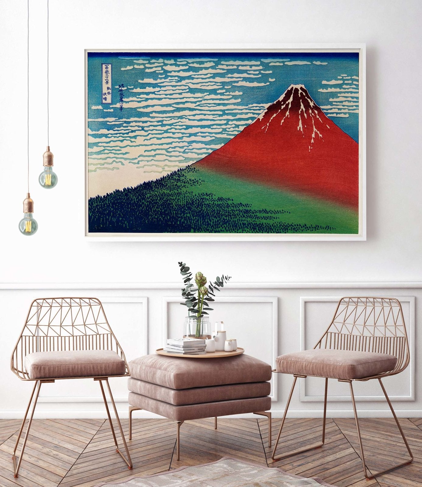 Die Mystik Japans, eingefangen im Poster „Nieselregen am Fuße des Fuji“. Sie werden direkt zu den malerischen Hängen des Berges transportiert und spüren die Atmosphäre des Kirschblütenlandes.