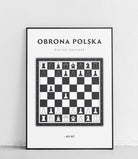 Plakat von „Polnische Verteidigung“. eine selten verwendete geschlossene Eröffnung, die 1913 von Alexander Wagner in die Turnierpraxis eingeführt wurde und durch die Züge gekennzeichnet ist