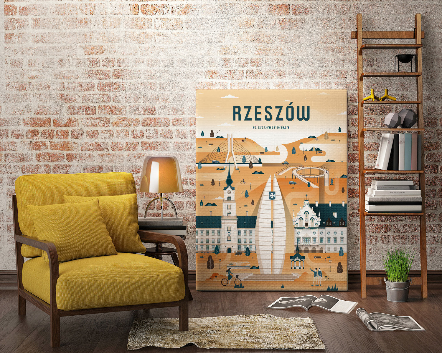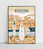 Auf dem Plakat sind die Symbole von Rzeszów abgebildet, d. h.: Rathaus, Denkmal der Revolutionsakte, Lubomirski-Schloss, Boulevards am Fluss Wisłok, Multimedia-Brunnen.