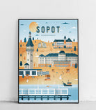 Das Poster zeigt die Symbole von Sopot: Grand Hotel, Pier, Leuchtturm, Rathausgebäude, Schiefes Haus.