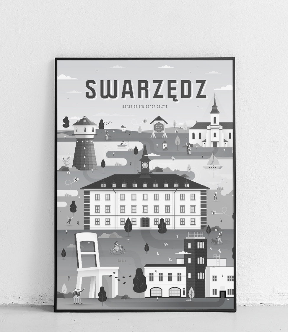 Auf dem Plakat sind die Symbole von Swarzędz abgebildet, darunter: das Rathaus, der Swarzędz-See, Segelboote und ein darauf schwimmender Yachthafen sowie ein Stuhl, ein Symbol der örtlichen Möbelfabriken.