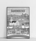 Auf dem Plakat sind Symbole von Świebodzice zu sehen, darunter: der PKP-Bahnhof, das Eingangstor zum Książ-Park, Verteidigungsmauern aus dem 13. Jahrhundert und eine Uhr aus der Becker-Fabrik, Michałki.