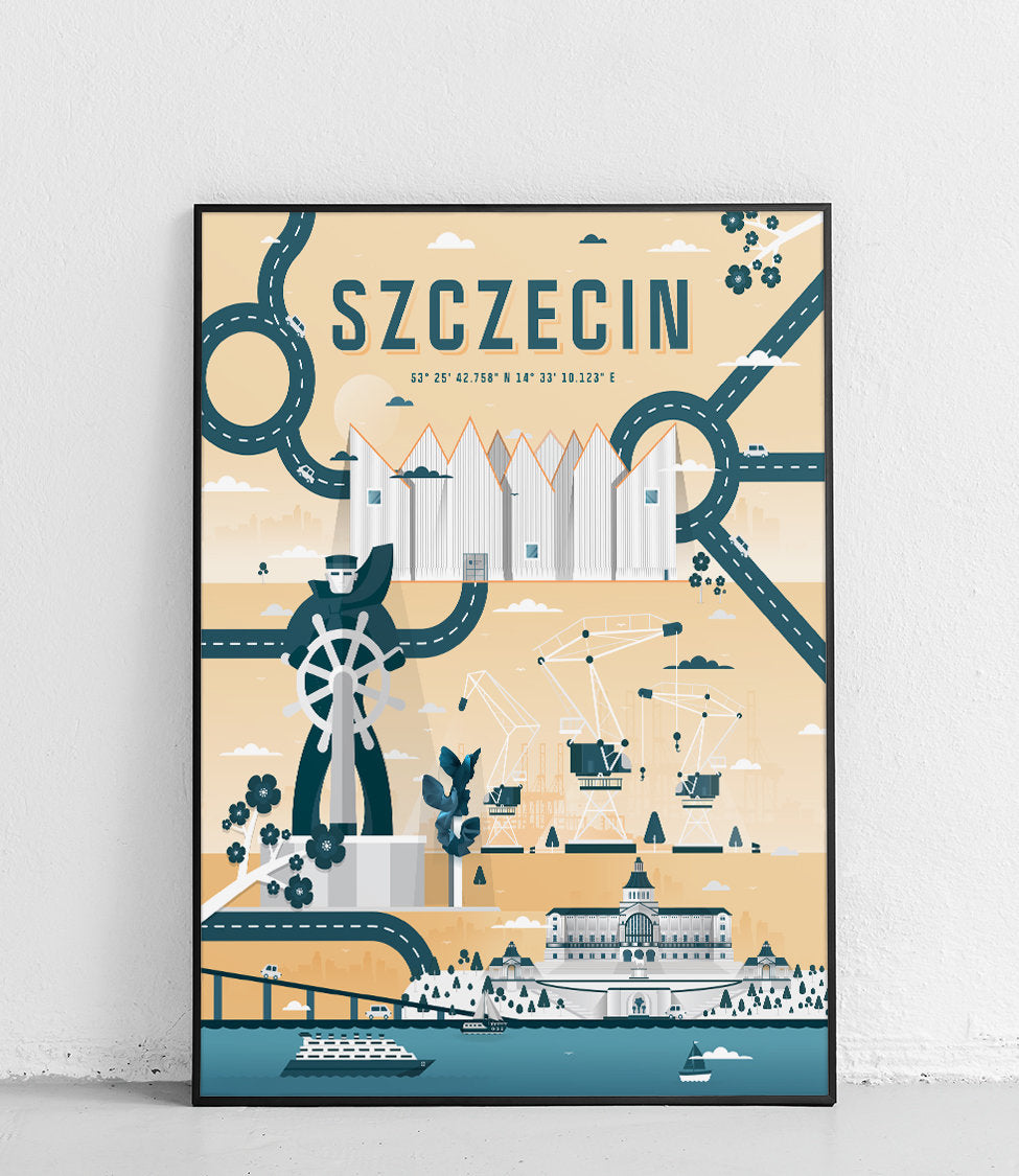 Auf dem Plakat sind die größten Symbole Stettins zu sehen, nämlich Wały Chrobrego, das Matrosendenkmal, das Schloss der Pommerschen Herzöge, die Kräne und die Philharmonie.