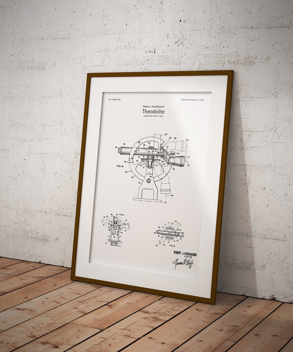 Theodolit – ein Poster, das ein Präzisionsmessgerät zeigt, das in der Geodäsie und im Bauwesen verwendet wird. Perfekt für Wissenschafts- und Technologieliebhaber.