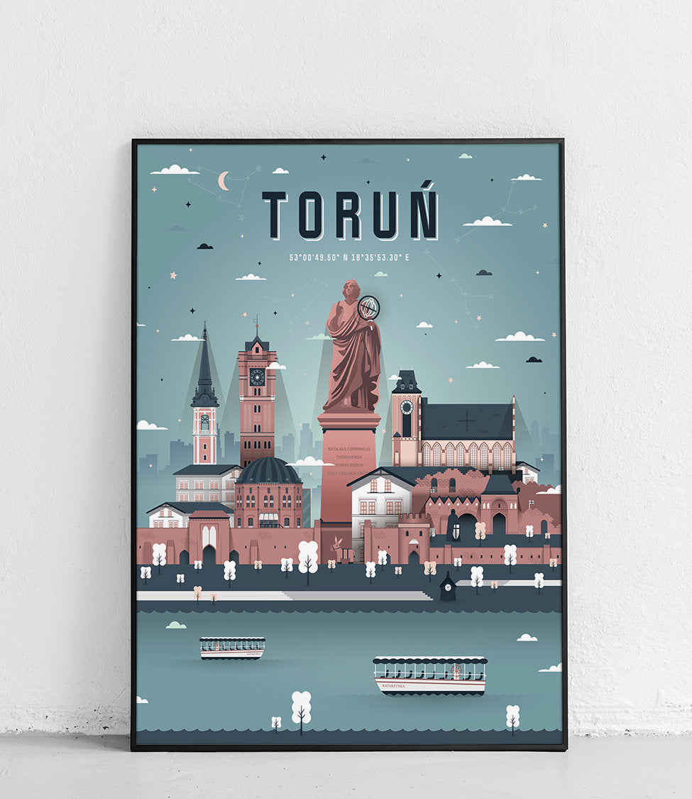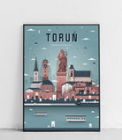 Das Poster zeigt die Wahrzeichen von Toruń, darunter die Altstadt, die Weichselboulevards, den Rathausturm, das Brückentor, die Ruinen der Deutschen Burg und die Kathedrale.