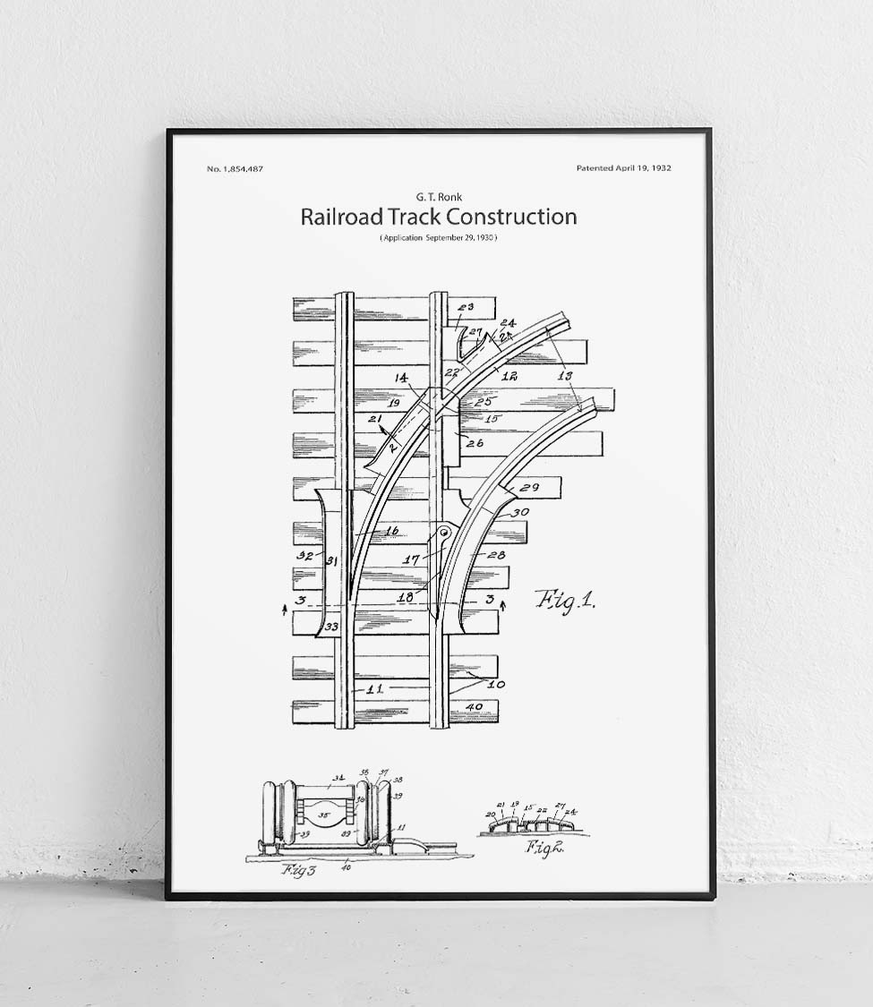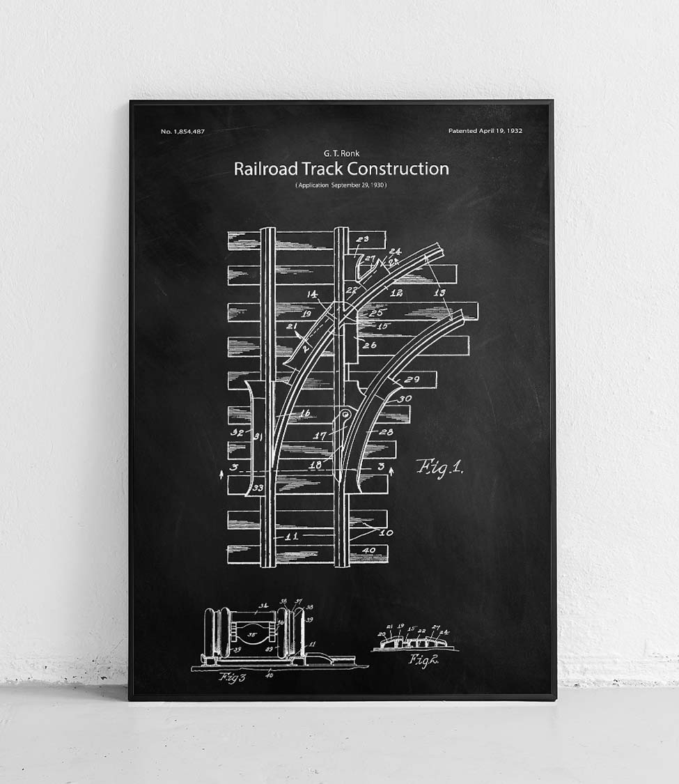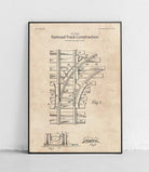 Ein Poster, das Eisenbahnschienen im minimalistischen Stil darstellt. Perfekt für Transport- und Industriebegeisterte.