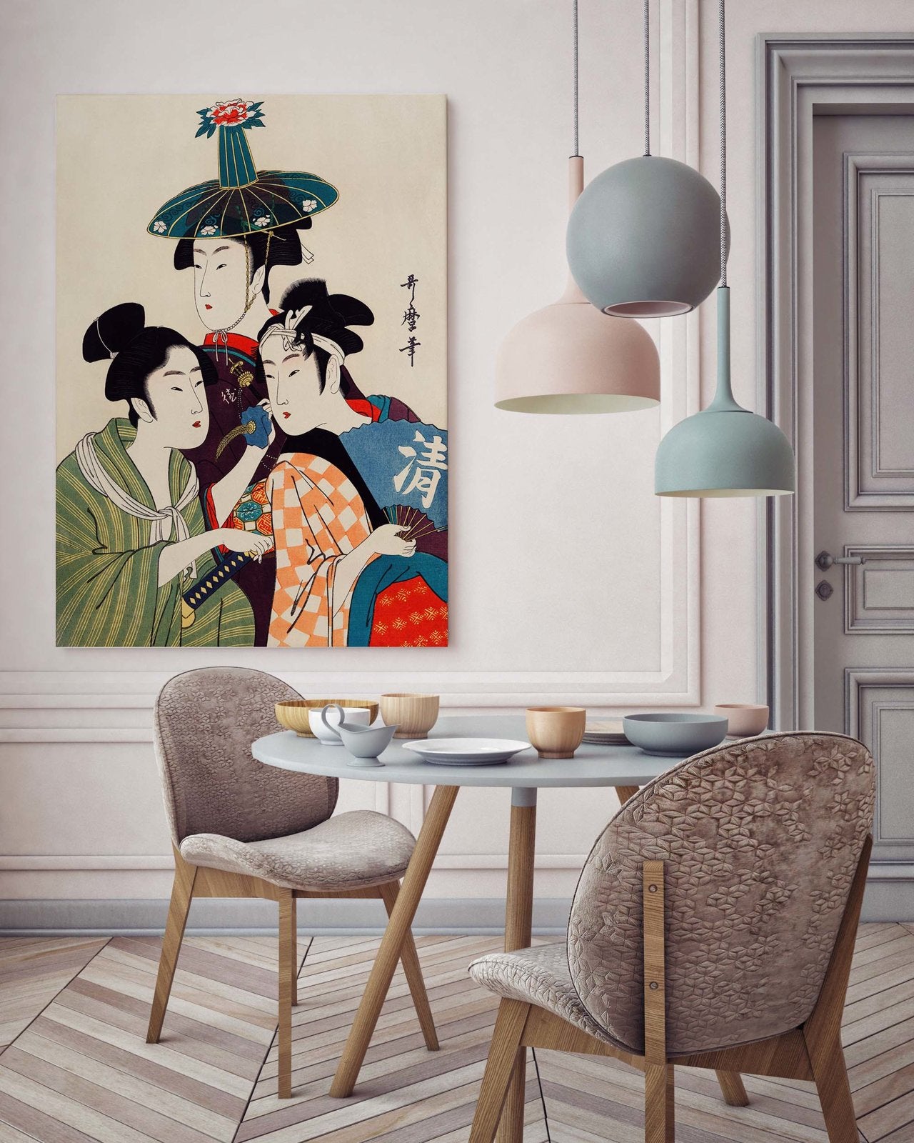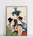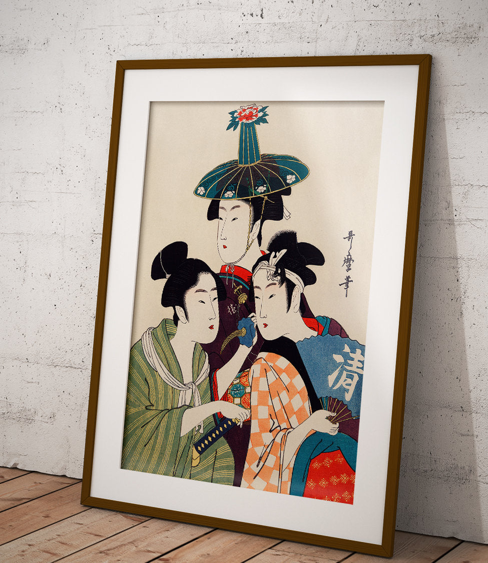 Drei junge Frauen vor dem Hintergrund japanischer Architektur. Die perfekte Ergänzung für Interieurs im orientalischen Stil.