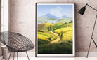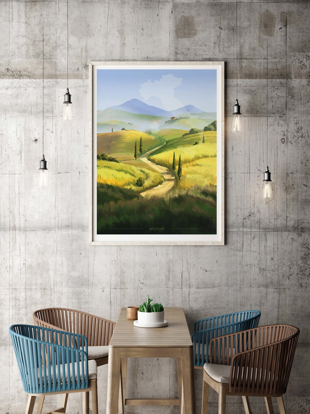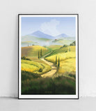 Das Italien-Poster zeigt eine Landschaft im Herzen der Toskana – das Orcia-Flusstal. Zypressenreihen führen zu einem einsam auf einem Hügel gelegenen Haus.