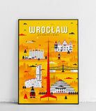 Auf dem Poster sind die größten Symbole Breslaus abgebildet, darunter: die Zwerge, der Turm, die Jahrhunderthalle, der Sky Tower, das Rathaus, das Panorama von Racławice und die Tumski-Brücke.