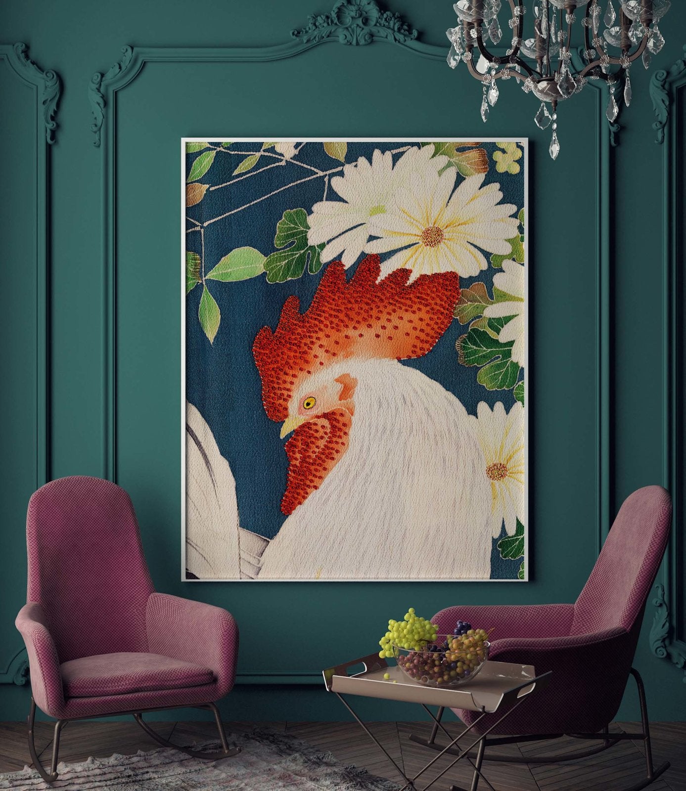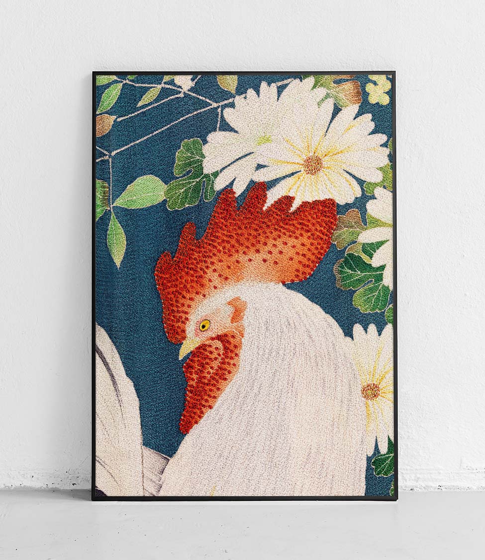 Hahnenmuster auf Kimonostoff - Poster mit Japan-Motiv. Perfekt zur Heimdekoration oder als Geschenk für Liebhaber der japanischen Kultur.