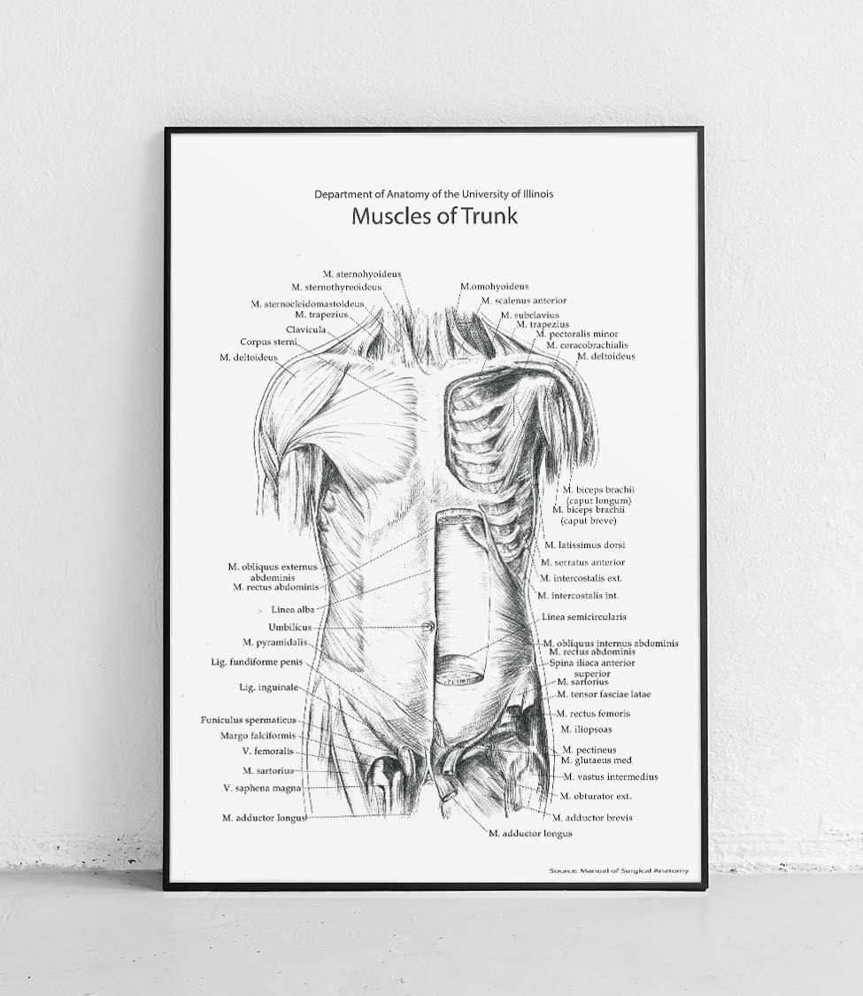 Anterior trunk muscles structure on white background - poster
