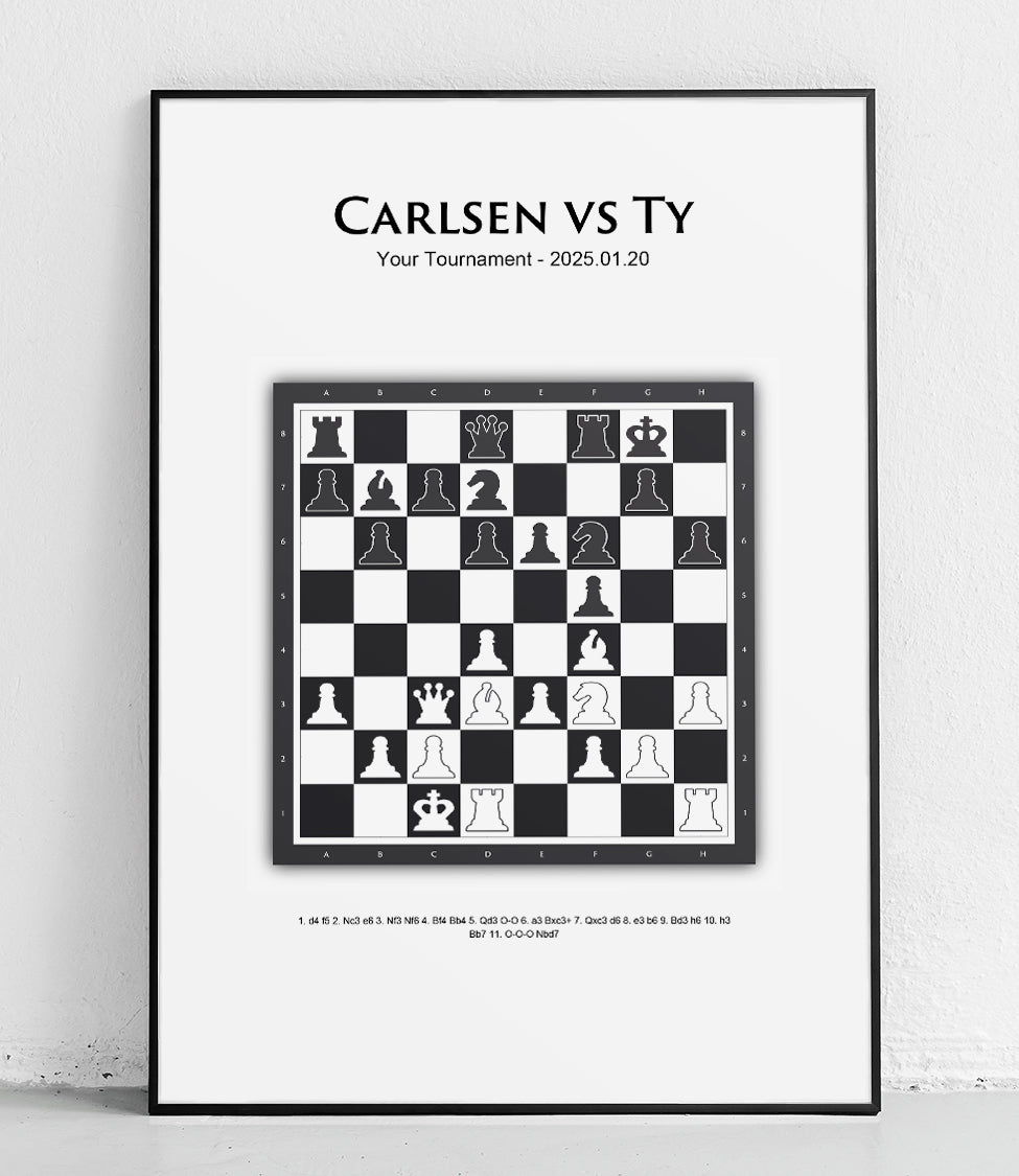 Na plakacie zostanie odwzorowany przebieg gry w eleganckiej, minimalistycznej formie, dzięki czemu stanie się nie tylko pamiątką, ale też stylowym dodatkiem do wnętrza. Idealny prezent dla miłośnika szachów, trenera, ucznia czy każdego, kto ceni piękno tej królewskiej gry.