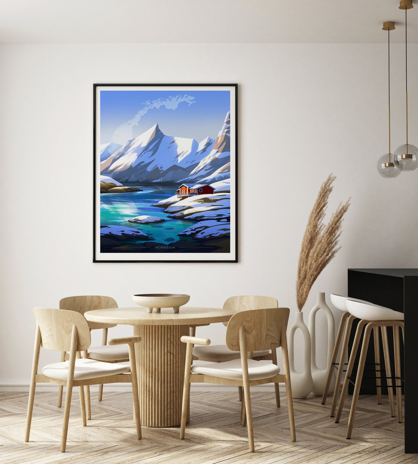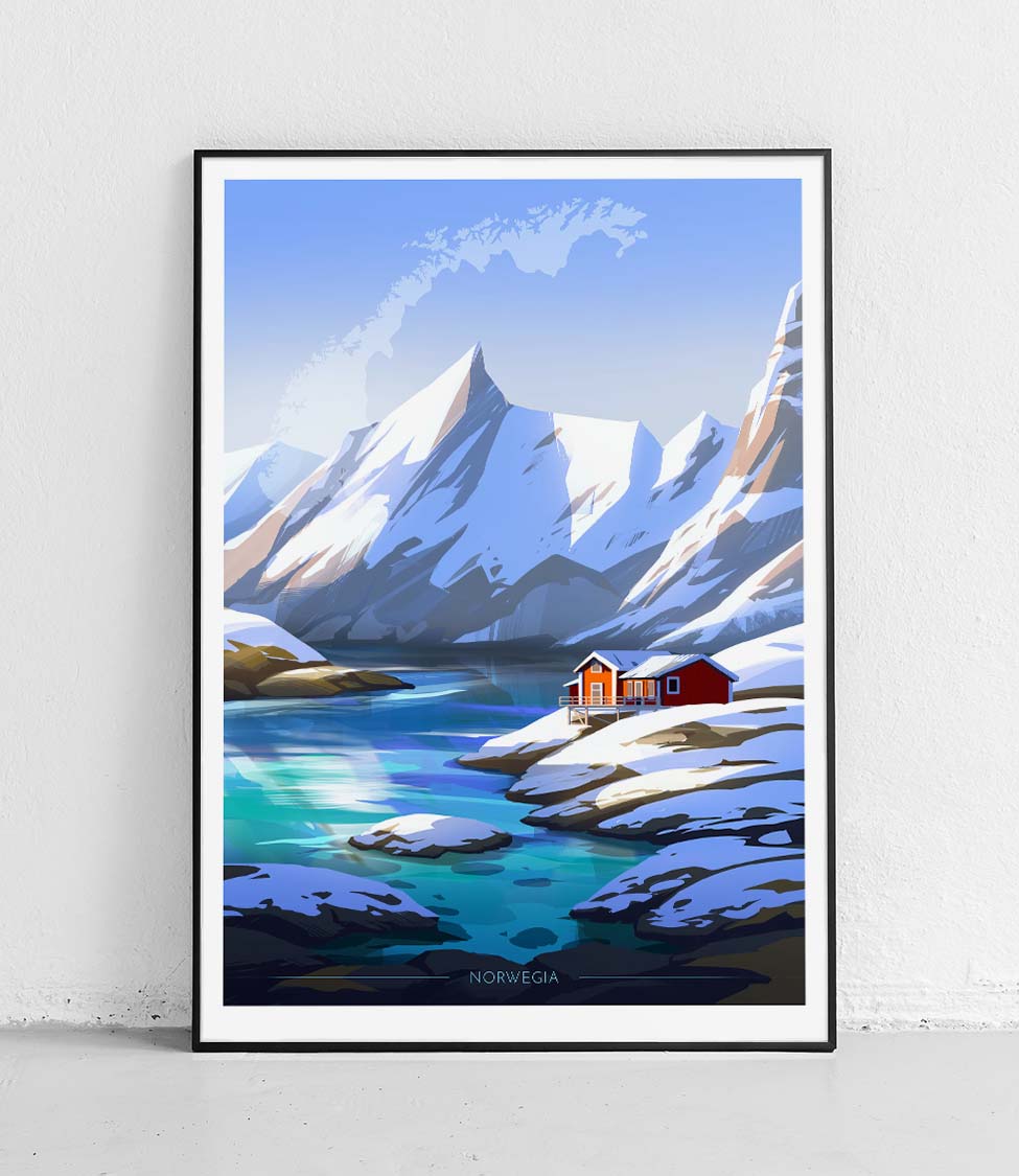 This poster depicts a unique region: Norway and its beautiful Lofoten Islands. Lofty is an archipelago in the Norwegian Sea off the northwestern coast of Norway, stretching 112 km from the tiny island of Røst in the south to the narrow Raftsundet strait, which separates it from the Vesterålen archipelago. It is separated from the mainland by the Vestfjorden strait.
